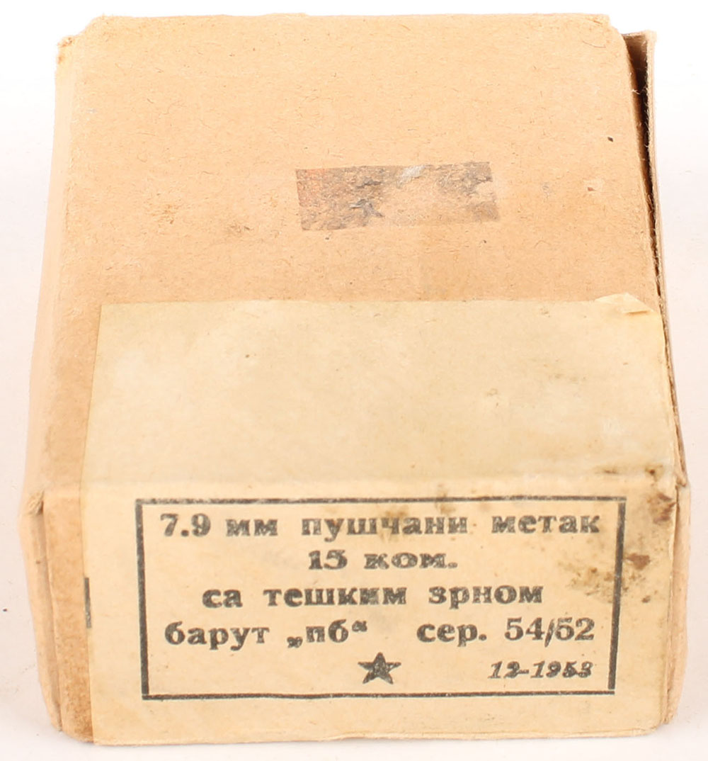 Yugo, 7.9mm (8mm Mauser), 15 Rd. box, 1953 dated, 1pc, FULL & SEALED, buff box & label with black print, box has pen marks, age soiling, sticker mark, & handling wear, ammo is corrosive. Grade: Very Good + - Value: 10 to 30