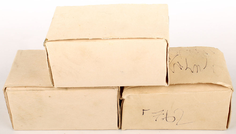 Lot of three, Bulgarian factory 10, 7.62x54mmR FMJ ball, copper washed steel case, 20 count boxes, 1pc, all Full, buff boxes with no labels, boxes have light rub marks & one is covered in pen marks, ammo is excellent, has corrosive primers. Grade: Excellent - Value: 20 to 50