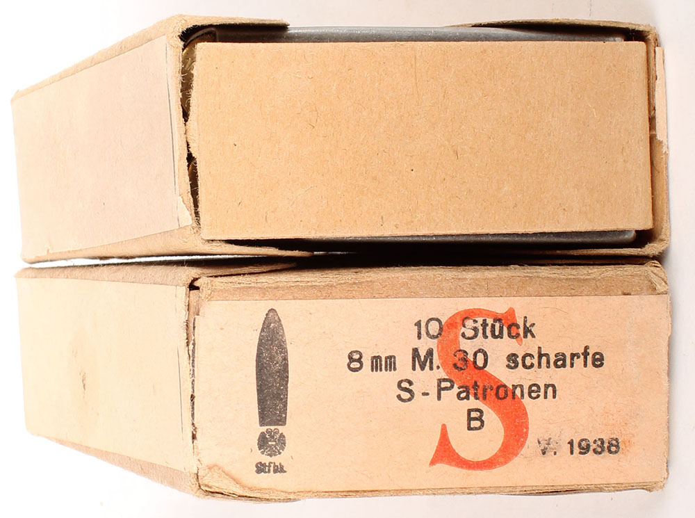 Lot of two Austrian, 8mm M.30 Scharfe S-Patronen (8x56mmR), 10 Rd. boxes on clips, 2pc, all Full, 20 total Rds. On clips, boxes are solid with some light rubbing wear, one box missing top label, ammo is dated 1938-1939. ammo ranges from very good to fair, has corrosive primers. Grade: Very Good ++ - Value: 10 to 40