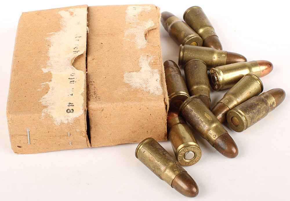 Lot of two, Midway 8mm Nambu, 12 count boxes with 11 loose Rds., two are Midway marked H/S, nine are unmarked H/S likely old Japanese WW2 surplus, 1pc, boxes, both boxes full, Total of 35 Rds., boxes have torn labels & WW2 German code markings, ammo ranged from very good to good, surplus ammo likely has corrosive primers. Grade: Very Good ++ - Value: 20 to 60