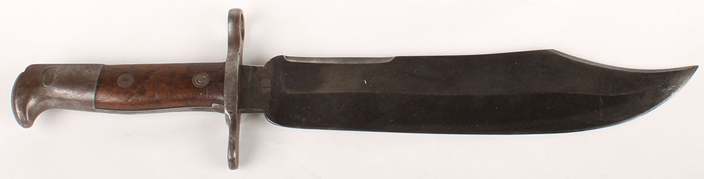 US, M1892 Krag bayonet that was modified to look like a M1900 Bowie bayonet. Wood grips, the blade was cut & a new blade was welded on just above the guard. Left side of blade marked ''1900'', right side ''US''. Grade: Very Good ++ - Value: 50 to 200
