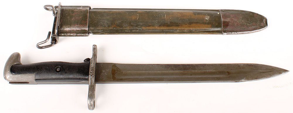 US, Greece contract, M1 bayonet & correct sheath. black plastic grips. The blades finish retains almost full coverage with spots of light wear, scratches, & patina. The guard & pommel retain full finish coverage with light wear. The black plastic grips have light scuffs. The left side of the blade is marked ''EN S'', ''E_'' flaming bomb ''US''. The left side of the guard is marked ''X3886''. The sheath has dings & finish wear & is marked with a faint ''E US'' in a flaming bomb. The sheath has many hand etched markings. Grade: Excellent + - Value: 80 to 200