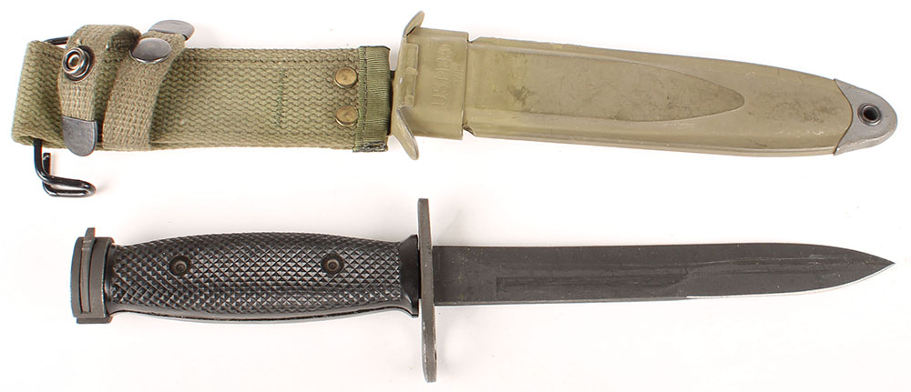 Korean Industries, M4 bayonet with M8A1 sheath, parkerized metal, checkered plastic grips, top of guard is marked ''U.S. M4'', flaming bomb ''K.I.''. Sheath marked ''U.S. M8A1'', ''PWH''. Sheath painted green, & has crack on edge. Grade: Excellent` - Value: 50 to 100