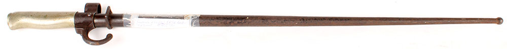 French, M1886 Lebel bayonet with sheath, Silver-alloy grip, unfinished cruciform blade, guard toned brown with rust patina. Quillon is marked ''77944''. Sheath has a few number stampings. Grade: Very Good - Value: 100 to 200
