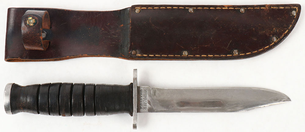 US, Kutmaster knife with sheath, Personal bought fighting knife, WW2 Era, leather handle, bare steel, blade has been sharpened, left side of blade marked ''KUTMASTER'', ''UTICA.N.Y.U.S.A.''. No markings on the sheath. Grade: Excellent - Value: 30 to 90