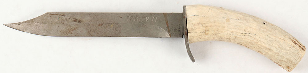Austrian, Zeitler 77 combat knife, replaced Antler grip, blade has spots of patina & rust, left side of blade marked ''ZEITLER 77''. Grade: Very Good + - Value: 16 to 60