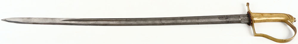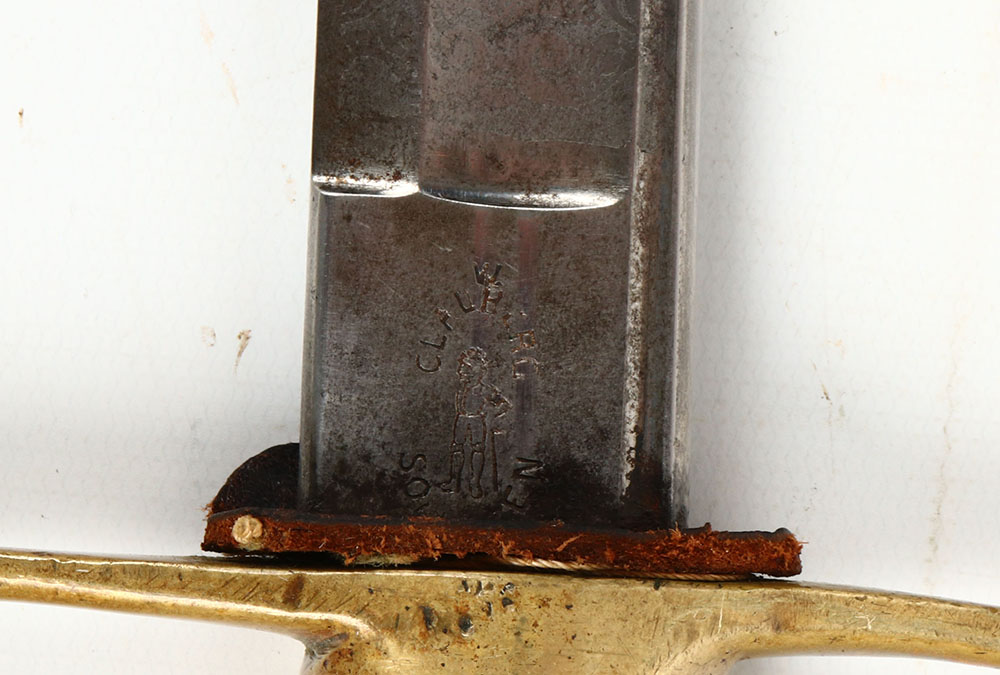 US, W. Clauberg, NCO foot officer sword, circa 1810's-20's, brass handle/guard, has patina & small dings. blade has minor spots dark patina. Both sides of blade are etched with intricate designs of American eagles, anchor, ''US'', ''NCO'', & other designs. Left side of blade is etched ''IRON PROOF'', & stamped ''W.'', ''CLAUBERG'', ''SOLINGEN'', around a knight. Grade: Excellent - Value: 100 to 300