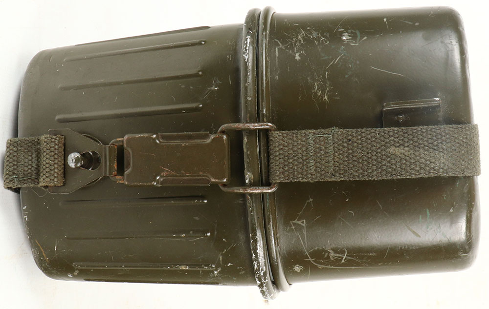 West German, M59 Canteen set, green paint, canteen & cup marked ''MM 79'' & ''MM 80''. Complete set, outside cups have scratches & wear. Grade: Excellent + - Value: 30 to 60