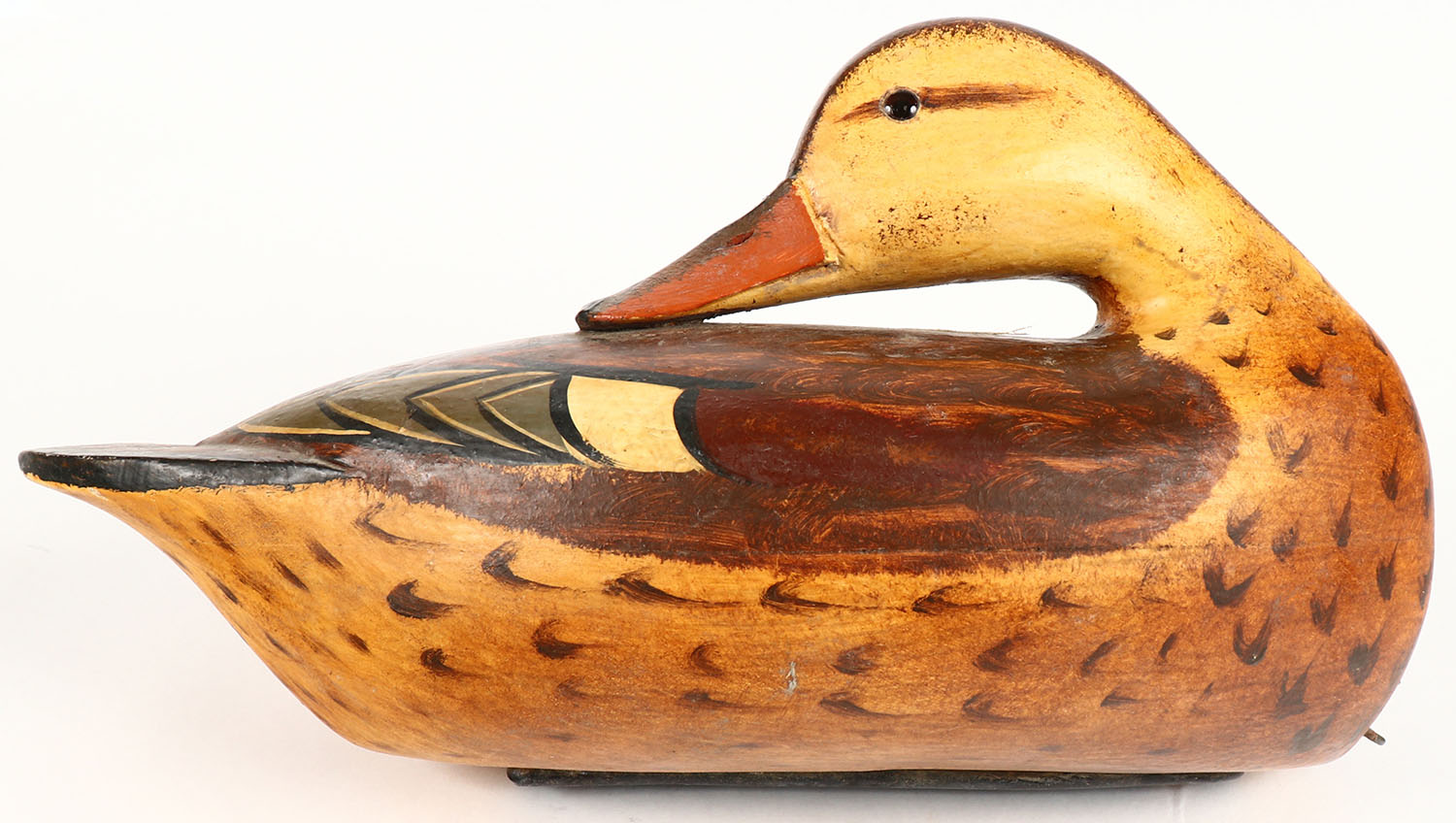 Preening Gadwall Hen by Jim Slack, Pekin, IL, glass eyes, hollow wood, excellent original paint, the Drake pair is in the previous lot, 12'' OAL. Grade: Excellent ++ - Value: 100 to 200