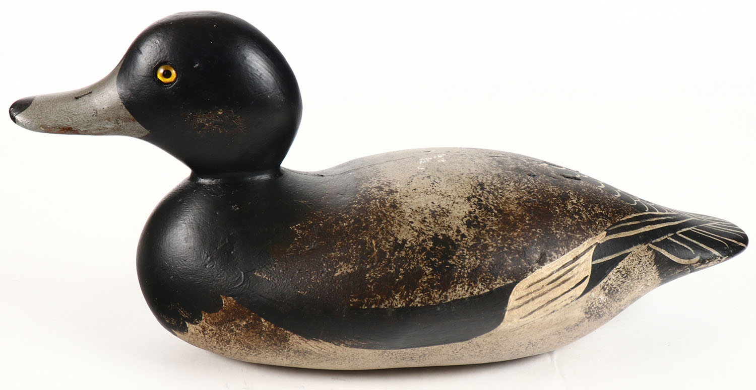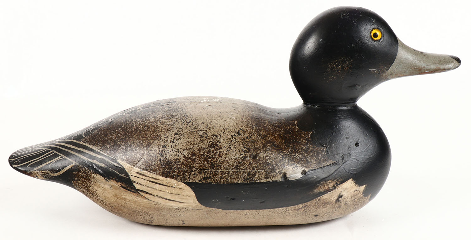 Bluebill Drake by Mason Decoy Company, Detroit, MI, 1896-1924, Standard Grade, glass eyes, repaint, solid wood, 14'' OAL. Grade: Excellent - Value: 30 to 100
