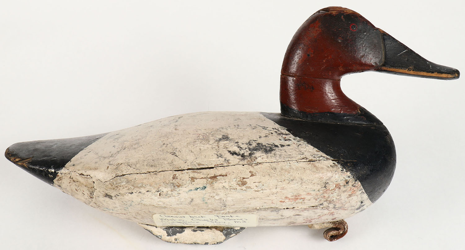 Early Canvasback Drake by Charles Barnes, Chesapeake Bay MD, circa 1900's, PE, old working repaint, leather line tie, show high hairline neck crack. 14 1/2'' OAL. Grade: Very Good - Value: 50 to 100