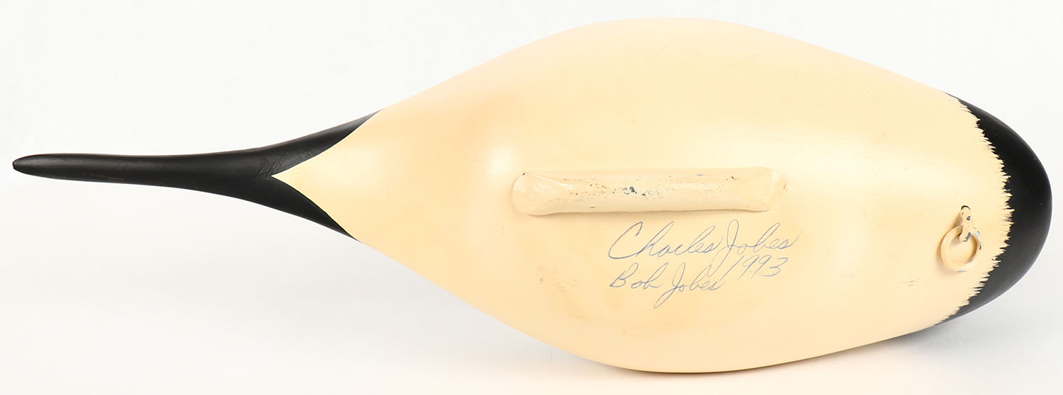 Old Squaw Drake by Charles Jobes & Bob Jobes, Havre De Grace, MD , painted eyes, solid wood, original paint, signed on bottom by CHARLES & BOB JOBES, structurally excellent, 18: OAL. Grade: Excellent ++ - Value: 40 to 100