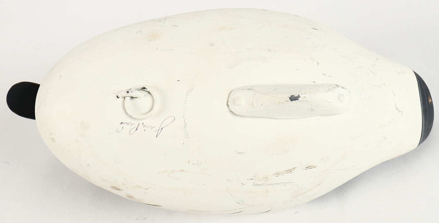 Bufflehead Drake by Jim Pierce, Havre De Grace MD, painted eyes, solid wood, structurally excellent, signed Jim Pierce & stamped ''JP'' on bottom, 13'' OAL. Grade: Excellent + - Value: 50 to 100