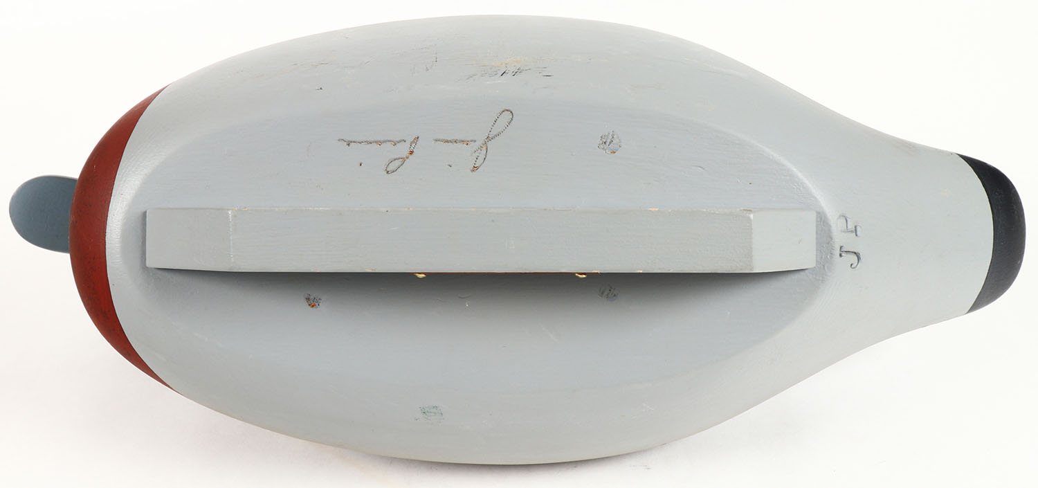 Widgeon Drake by Jim Pierce, Havre De Grace MD, painted eyes, solid wood, structurally excellent, signed Jim Pierce & stamped ''JP'' on bottom, 15'' OAL. Grade: Excellent + - Value: 50 to 100