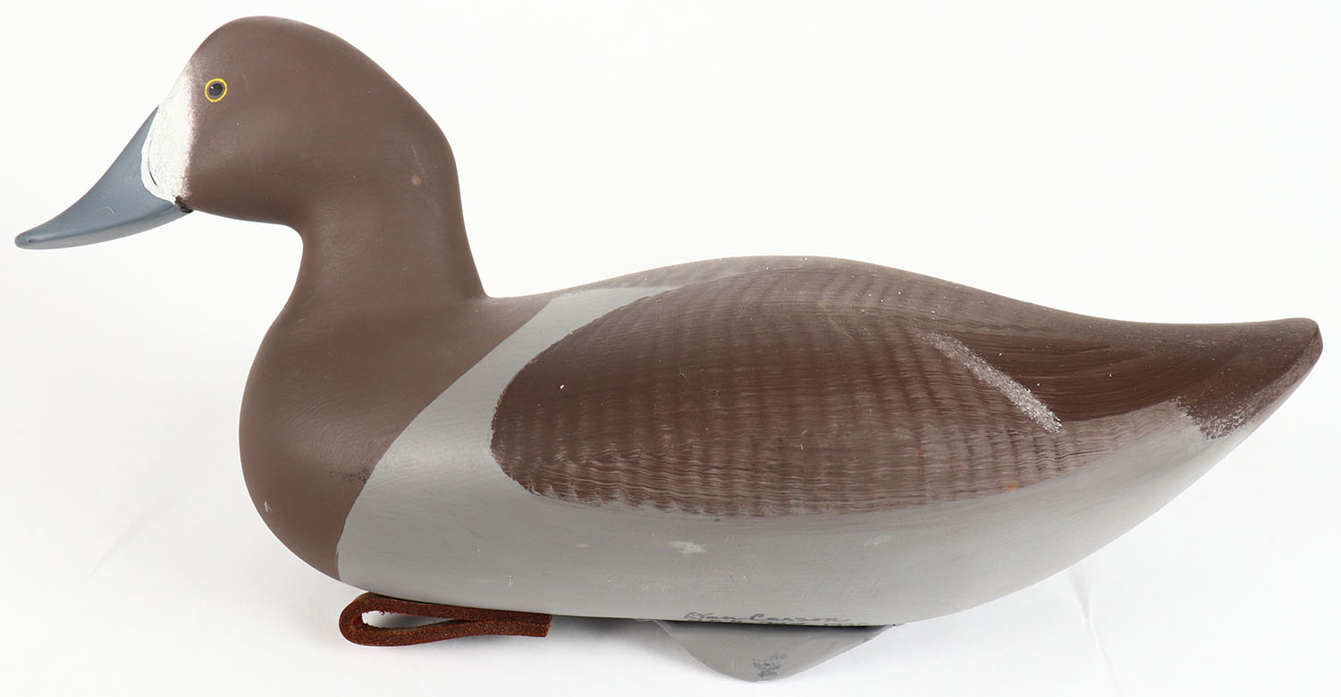 Bluebill Hen by Dan Carson, Havre De Grace, MD, PE, solid wood, original paint, structurally excellent, signed on bottom, 15'' OAL. Grade: Excellent ++ - Value: 40 to 80