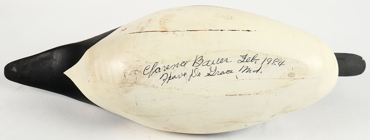 Pintail Drake by Clarence ''Titbird'' Bauer, Haver de Grace MD, (1925-2006), PE, solid wood, nice original paint, structurally excellent, Clarence worked for Jim Curriers Decoy shop, Madison Mitchell & Capt. Bob's Decoy Shop over the years, 17'' OAL, Grade: Excellent + - Value: 40 to 80