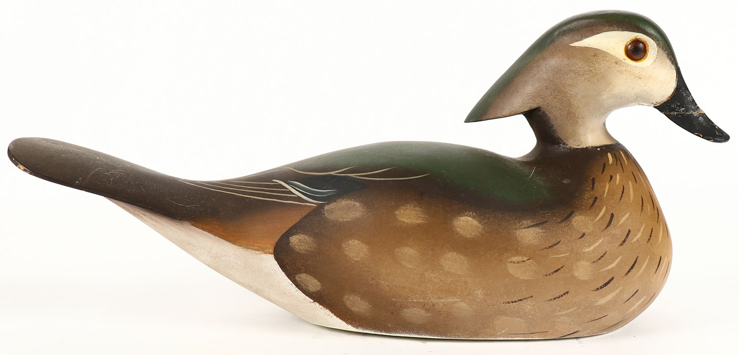 Woodduck Hen by John Meredith, Worton MD, GE, hollow wood, original paint, has a repair crack to bill, 13'' OAL. Grade: Very Good ++ - Value: 40 to 80