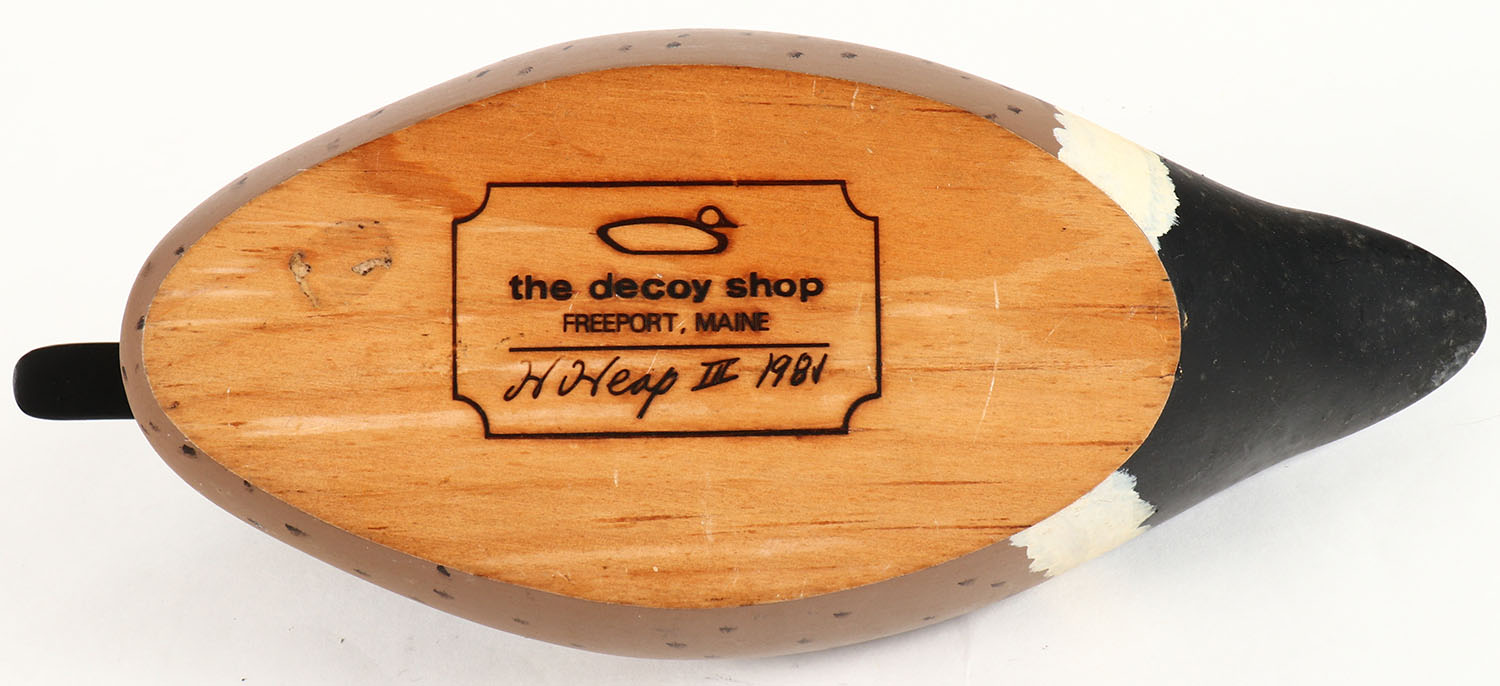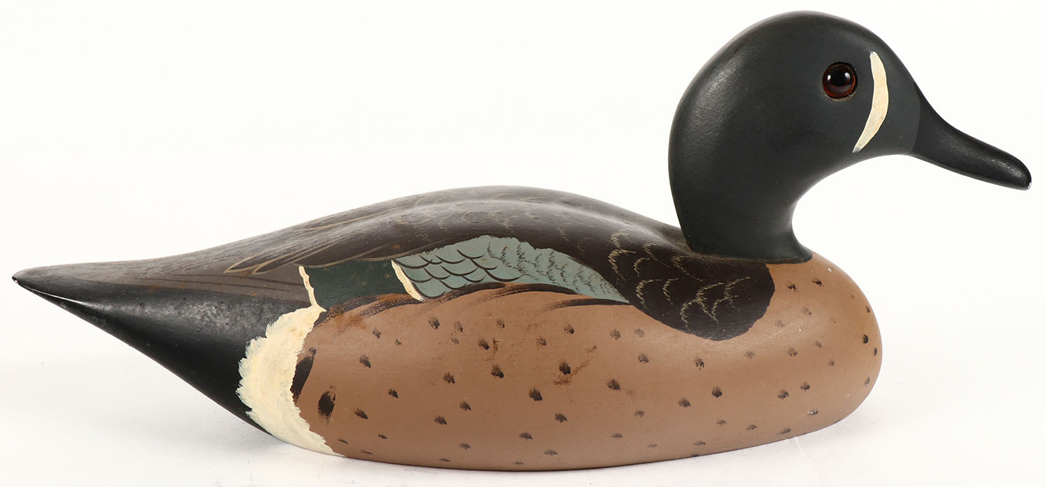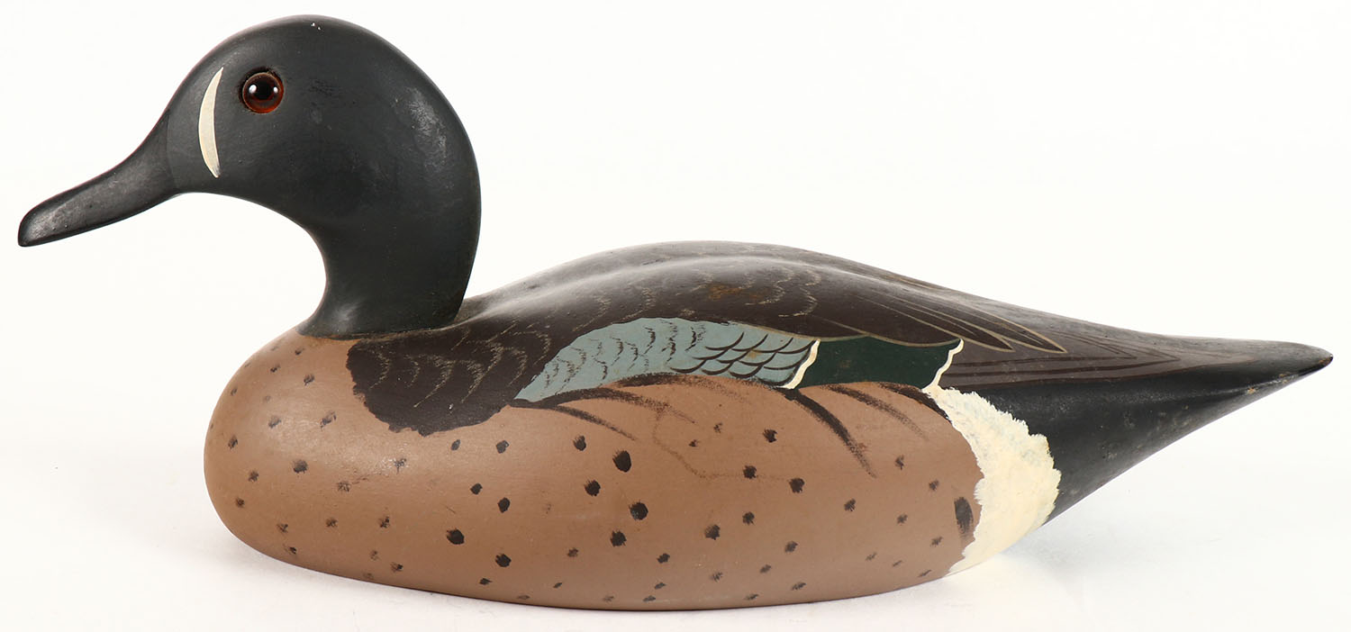 Bluewing Teal Drake by The Decoy Shop Freeport, Maine, H. Heap III, GE, solid wood, excellent original paint, branded on bottom, 11'' OAL. Grade: Excellent ++ - Value: 20 to 80