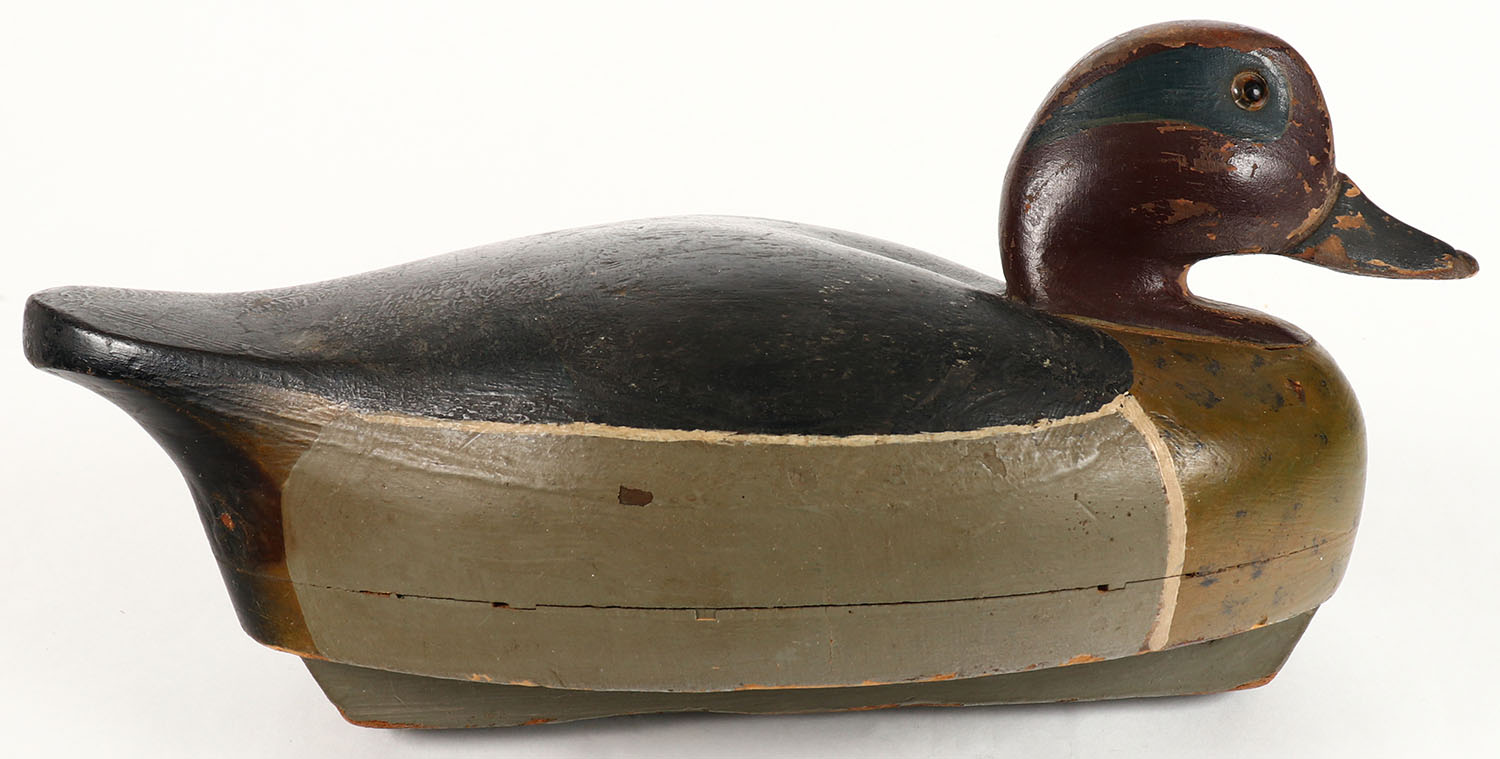 Greenwing Teal Drake by Wildfowler Decoy Co. Quogue, Long Island NY, GE, hollow wood, orignal paint, stamped on bottom. Grade: Excellent - Value: 50 to 150