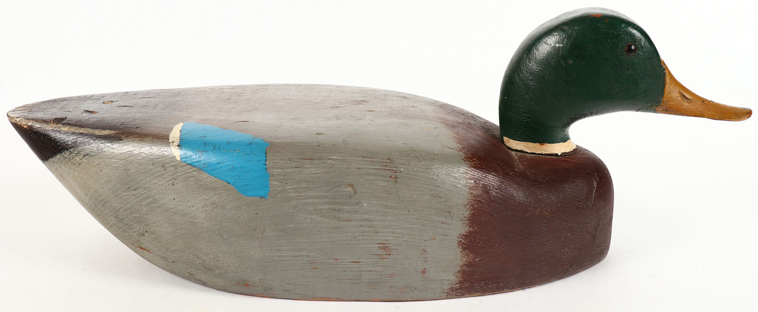 Mallard Drake by unknown maker, GE, solid wood, original paint, bill has repaired crack, 16 1/2'' OAL. Grade: Very Good ++ - Value: 20 to 40