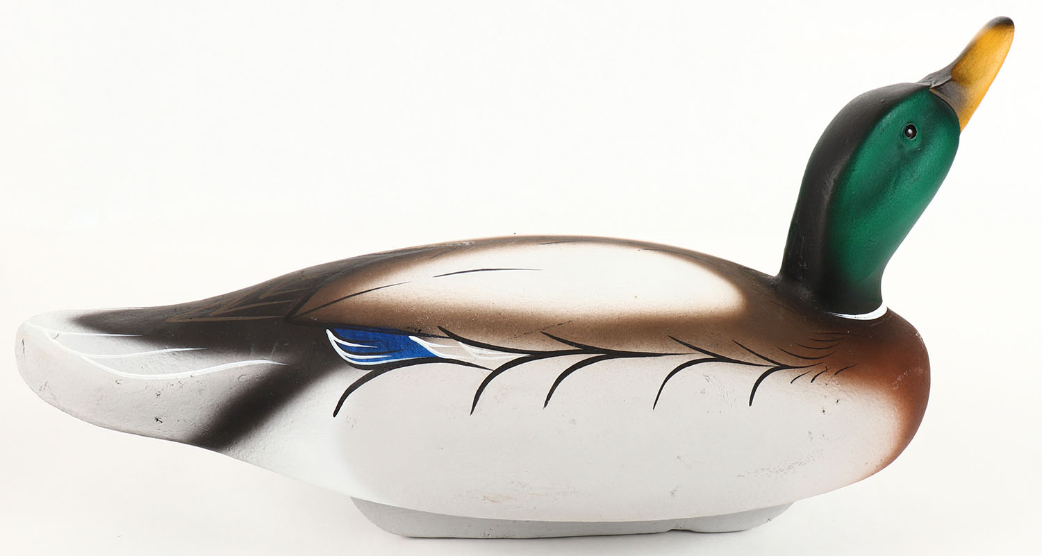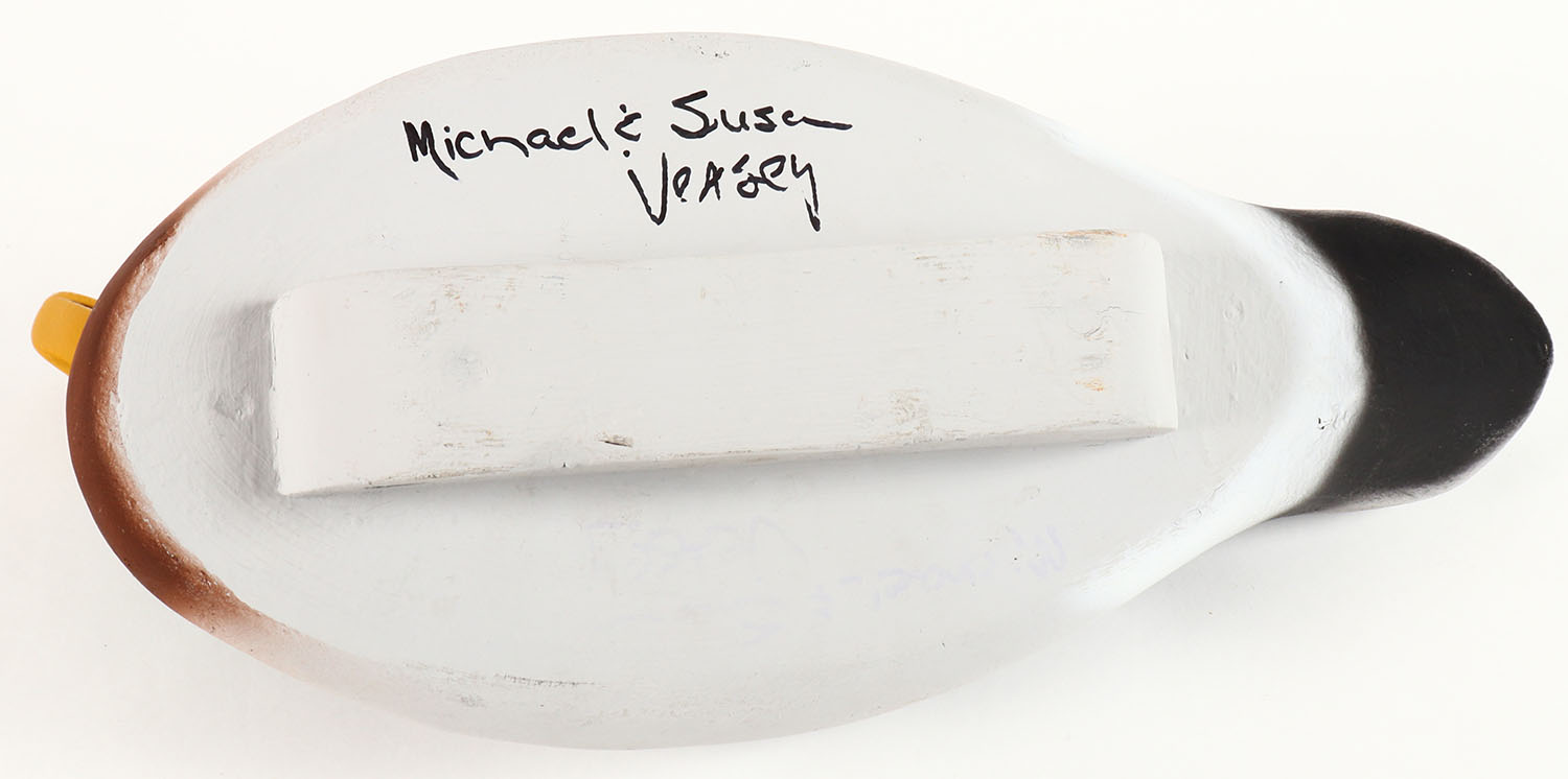 Mallard Drake by Michael & Susan Veasey, MD, glass eyes, solid wood, original paint, 17'' width, structurally excellent. Grade: Excellent ++ - Value: 20 to 60