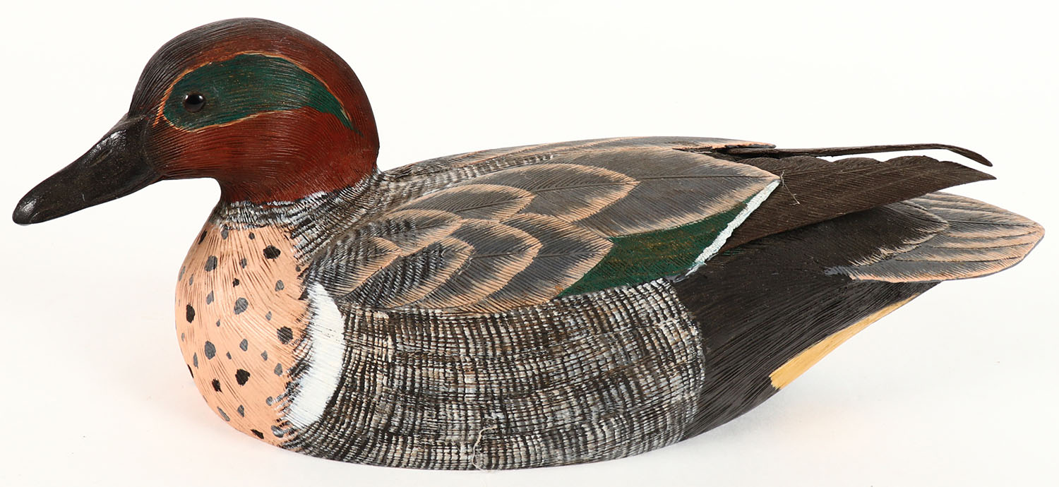 Greenwing Teal Drake by Tricia Veasey, GE, solid wood, original paint, structurally excellent, wonderful feather detail & wing relief. Grade: Excellent ++ - Value: 20 to 40