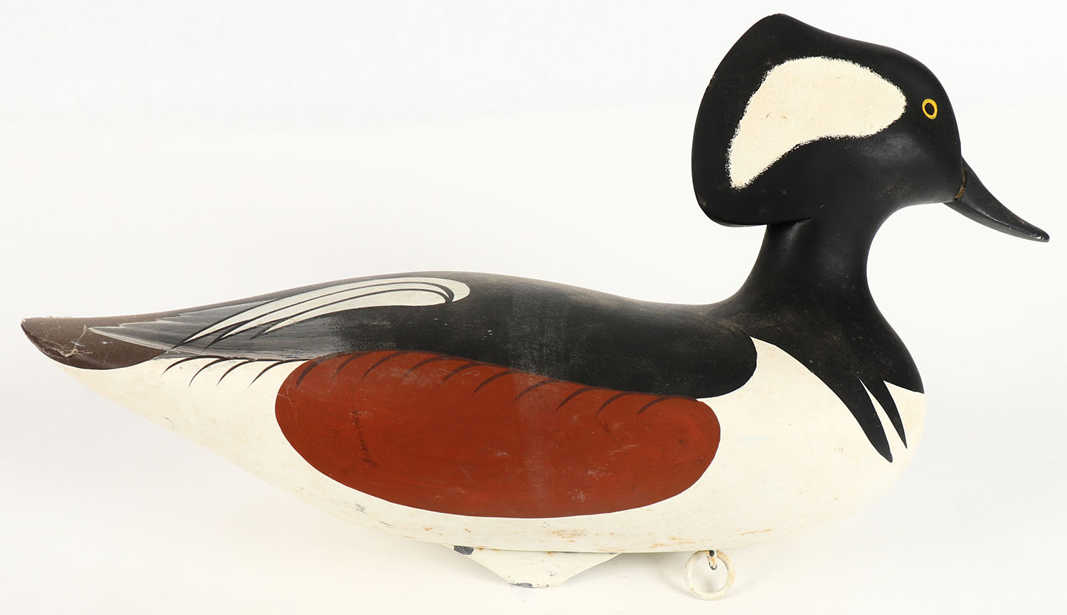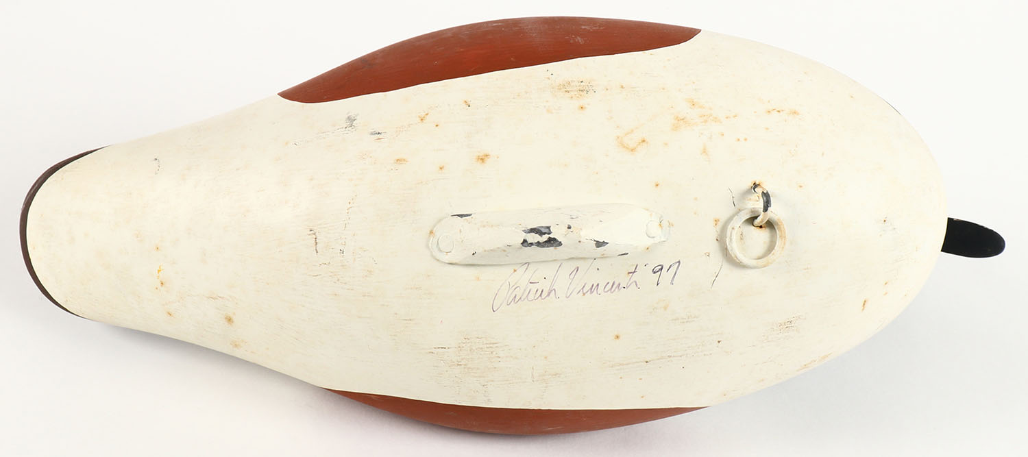 Hooded Merganser by Patrick ''Pat'' Vincent, Churchville, MD, painted eyes, solid wood, original paint, structurally excellent, signed on bottom, 14 1/2'' OAL. Grade: Excellent ++ - Value: 50 to 100