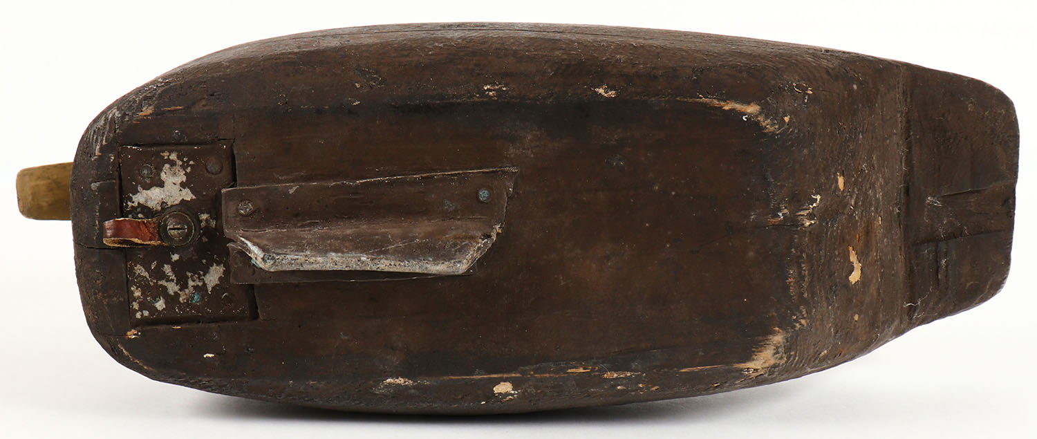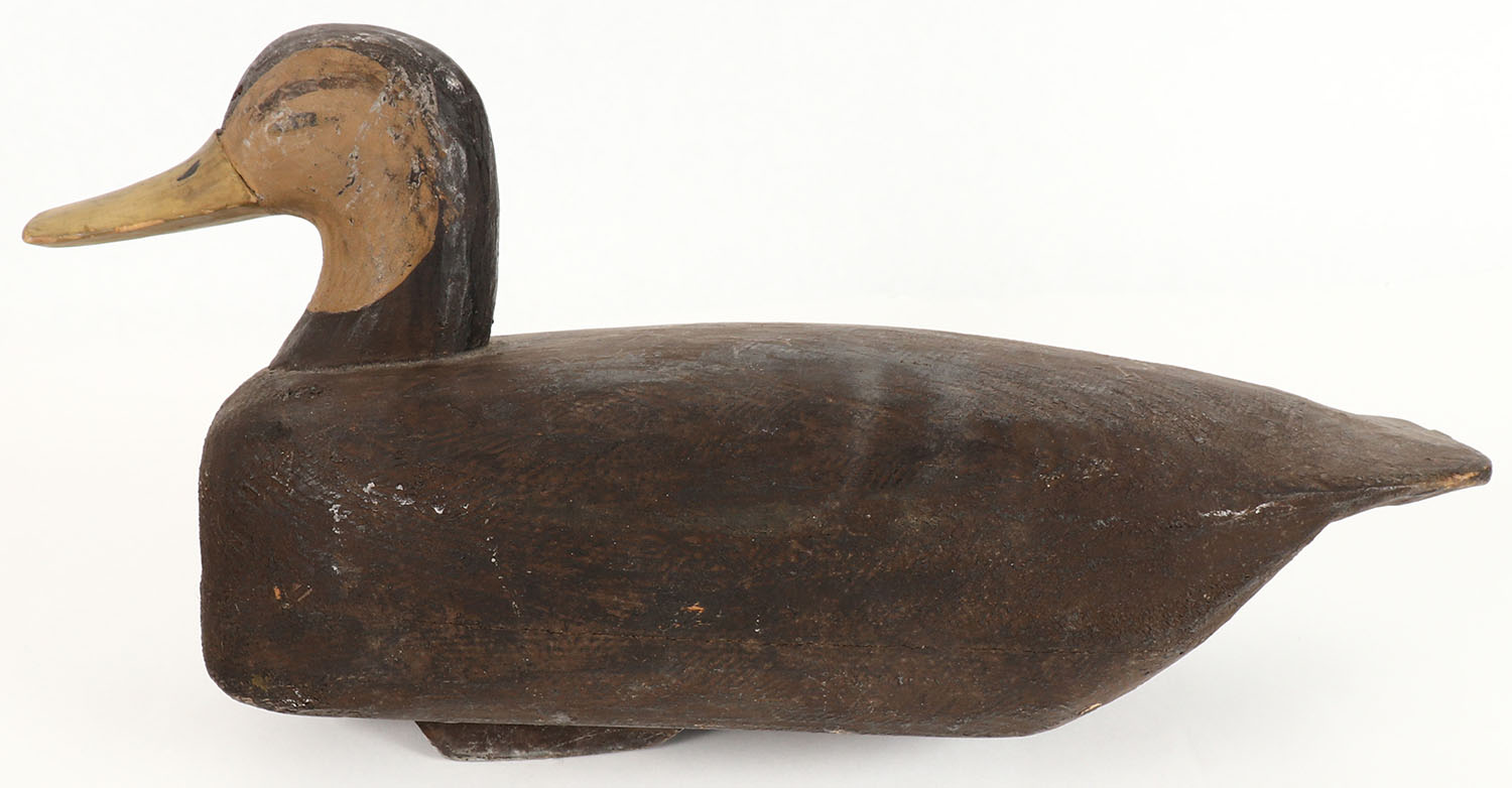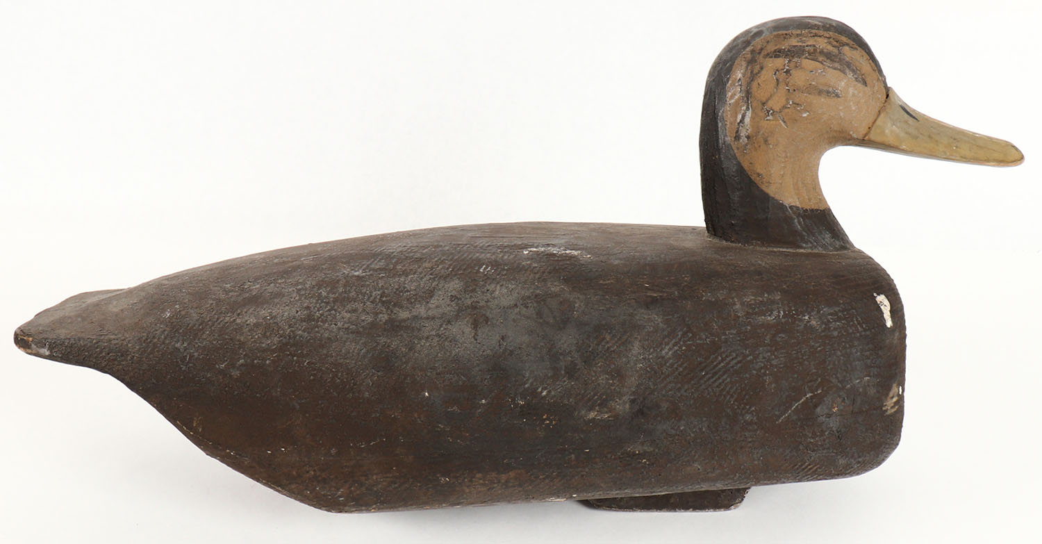Black Duck by unknown maker, no eyes, hollow wood, original paint, structurally excellent, 15 1/2'' OAL. Grade: Excellent - Value: 20 to 40