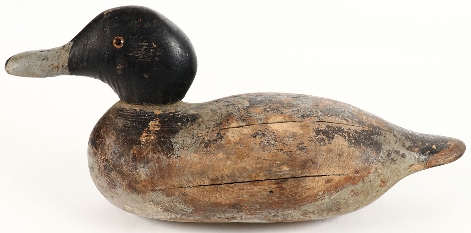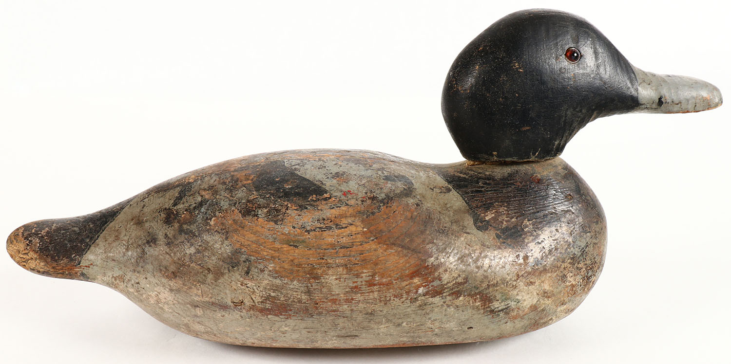 Bluebill Drake by Mason Decoy Company, Detroit, MI, 1896-1924, Standard Grade, glass eyes, solid wood, paint shows wear, has replaced head, structurally excellent, 14'' OAL. Grade: Very Good ++ - Value: 20 to 60
