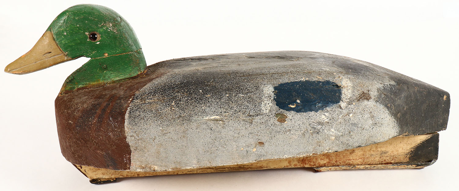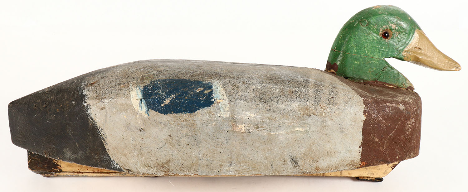 Mallard Drake by unknown maker, GE, solid wood, original paint shows wear, has age crack to neck, 20'' OAL. Grade: Very Good + - Value: 20 to 40