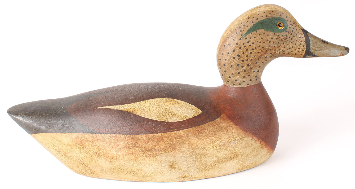Widgeon Drake by PK, GE, solid wood, original paint, branded PK on bottom, 14 1/2'' OAL. Grade: Excellent - Value: 20 to 40
