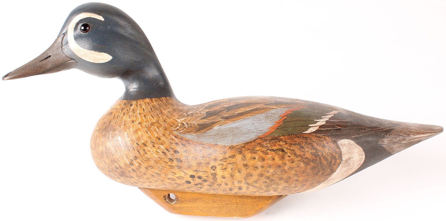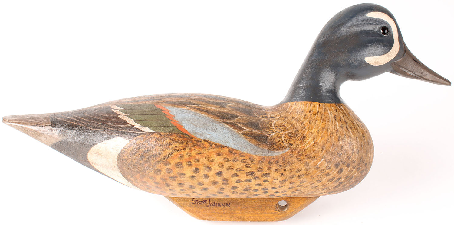 Bluewing Teal Drake by Stor Johann, GE, solid wood, mint original paint, 13'' OAL. Grade: MINT - Value: 70 to 200