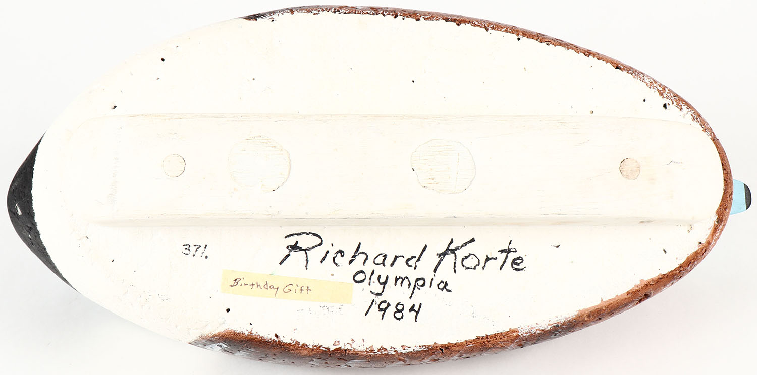 Widgeon Drake by Richard Korte, Olympia WA, GE, solid cork, mint orignal paint, 16'' OAL. Grade: MINT - Value: 40 to 80