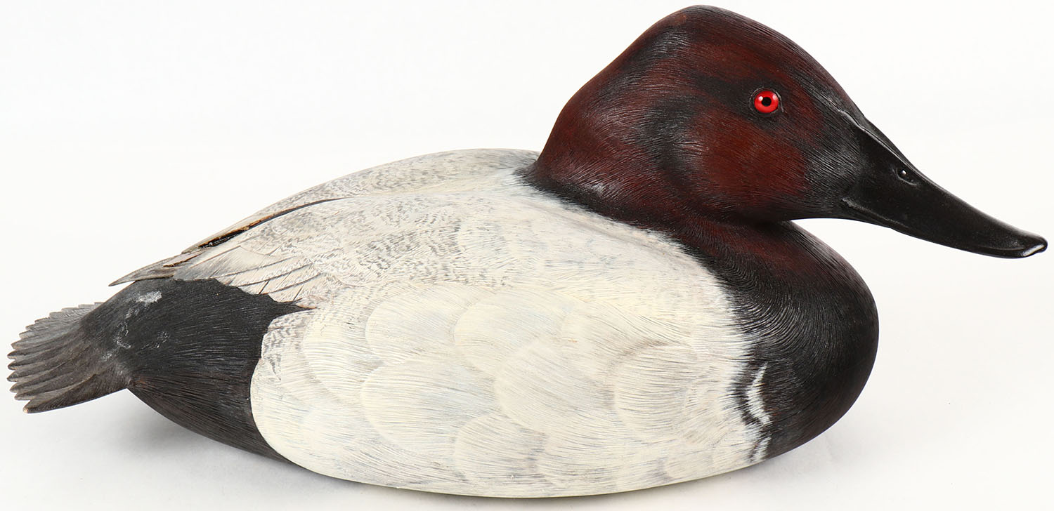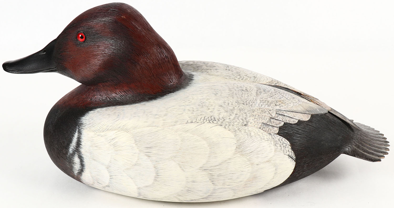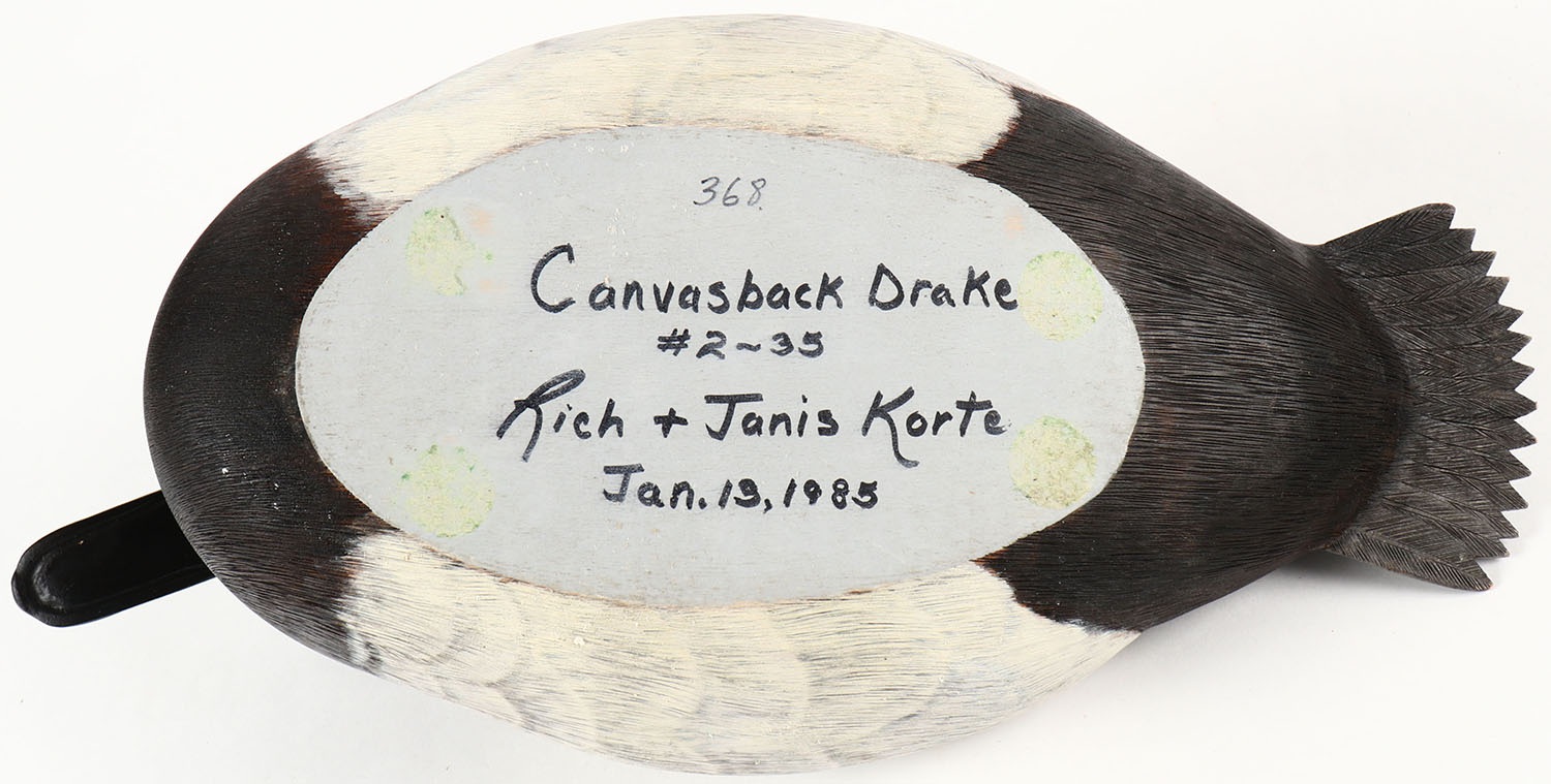 Canvasback Drake by Richard & Janis Korte, Olympia, WA, circa 1985, GE, solid wood, mint original paint with feather detail, one wing tip broken off, 14 1/2'' width. Grade: Excellent - Value: 30 to 90