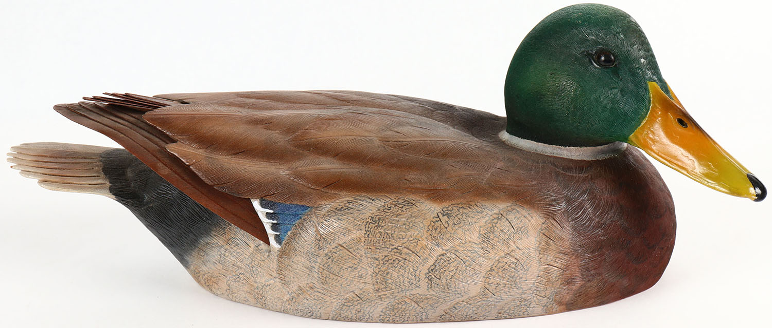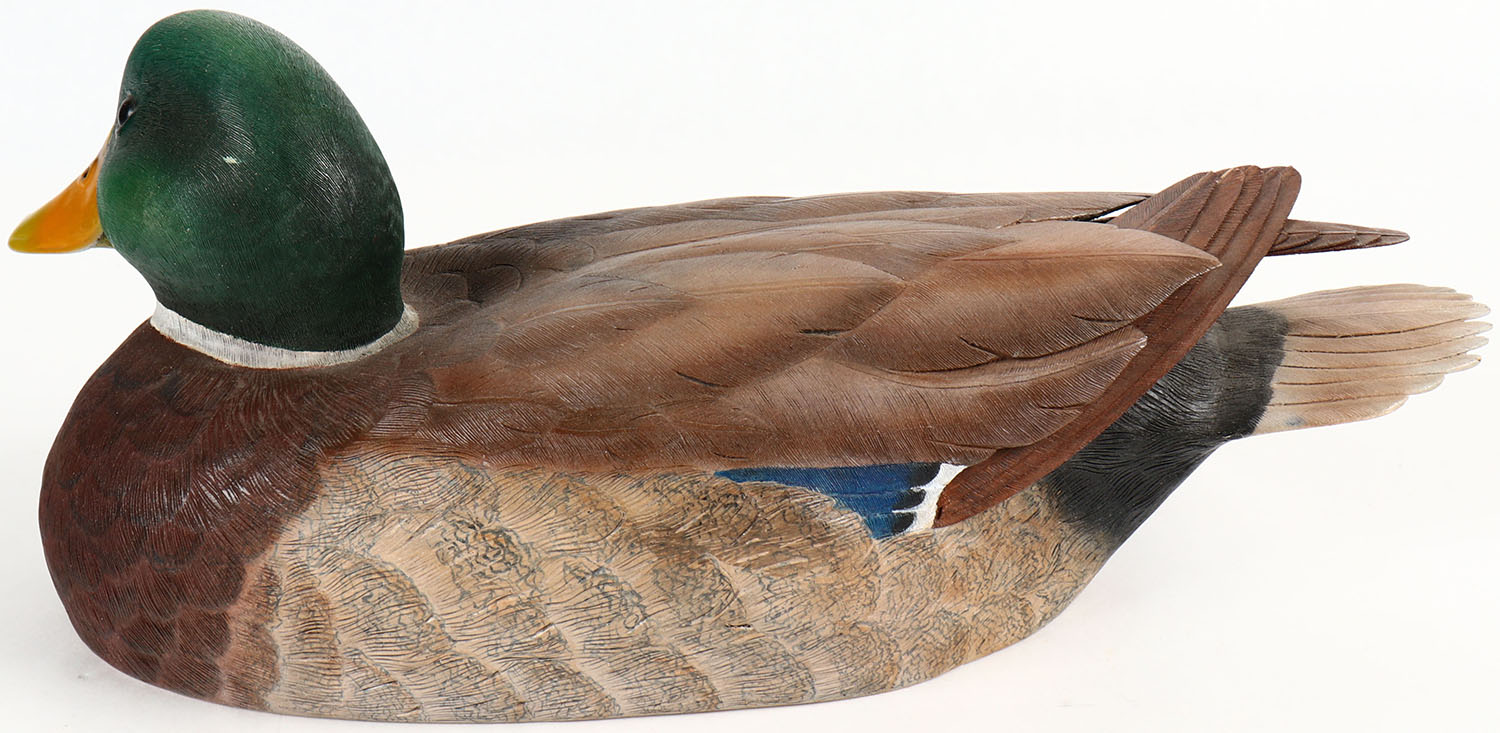 Mallard Drake by Rafi Bensimone, 1986, GE, solid wood mint original paint with wonderful feather detail, 10 wing tip feathers are individually carved with detail feathering, signed on bottom, 14 1/2'' OAL. Grade: Excellent ++ - Value: 30 to 90