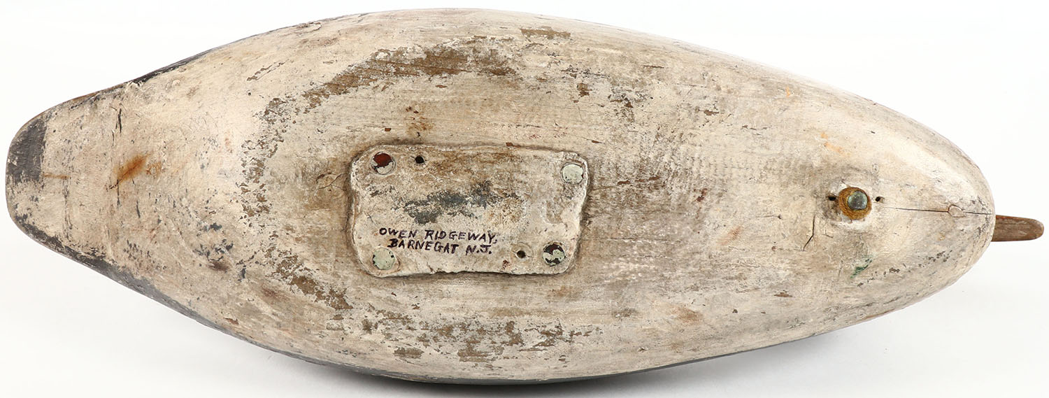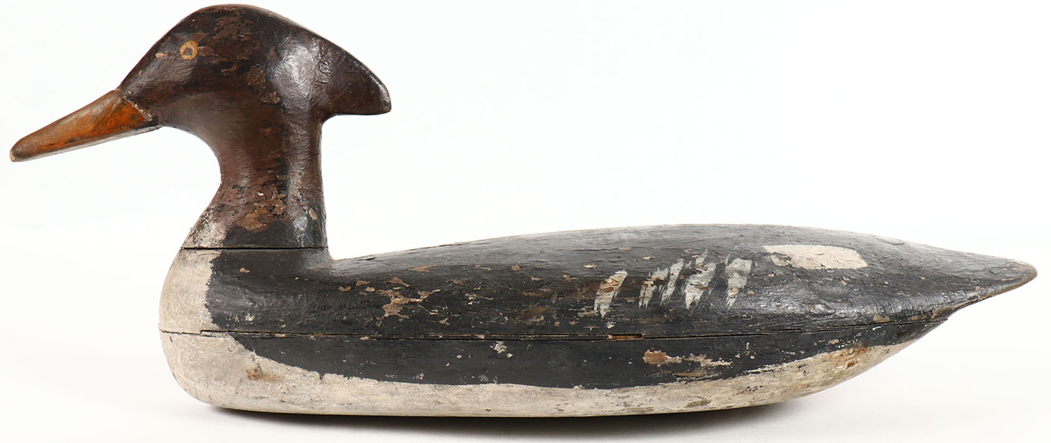 RARE Hooded Merganser Hen by Owen Ridgeway, Barnegat, NJ, PE, hollow wood, orignal paint, body is made of 2pc construction, nice early decoy, 15 1/2'' OAL. Grade> Excellent - Value: 30 to 90