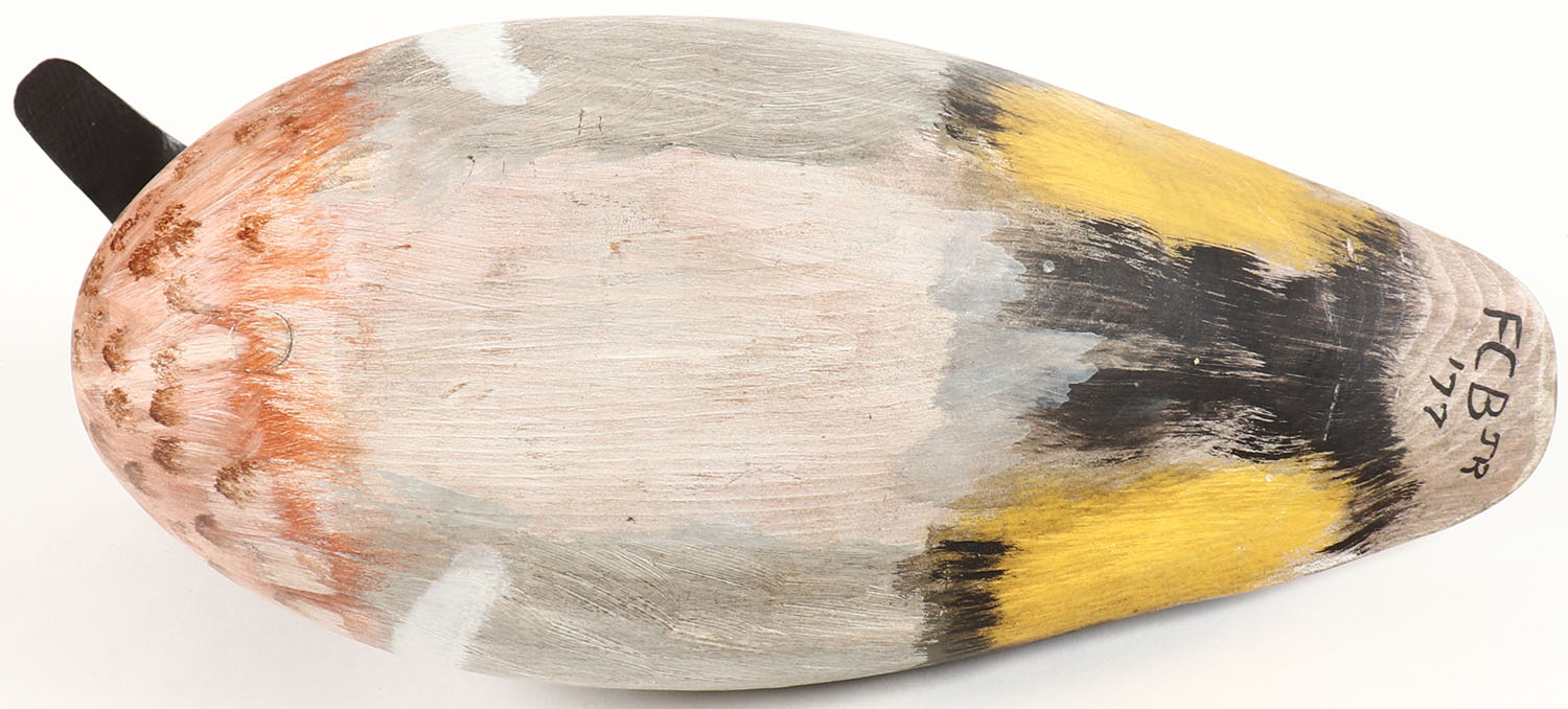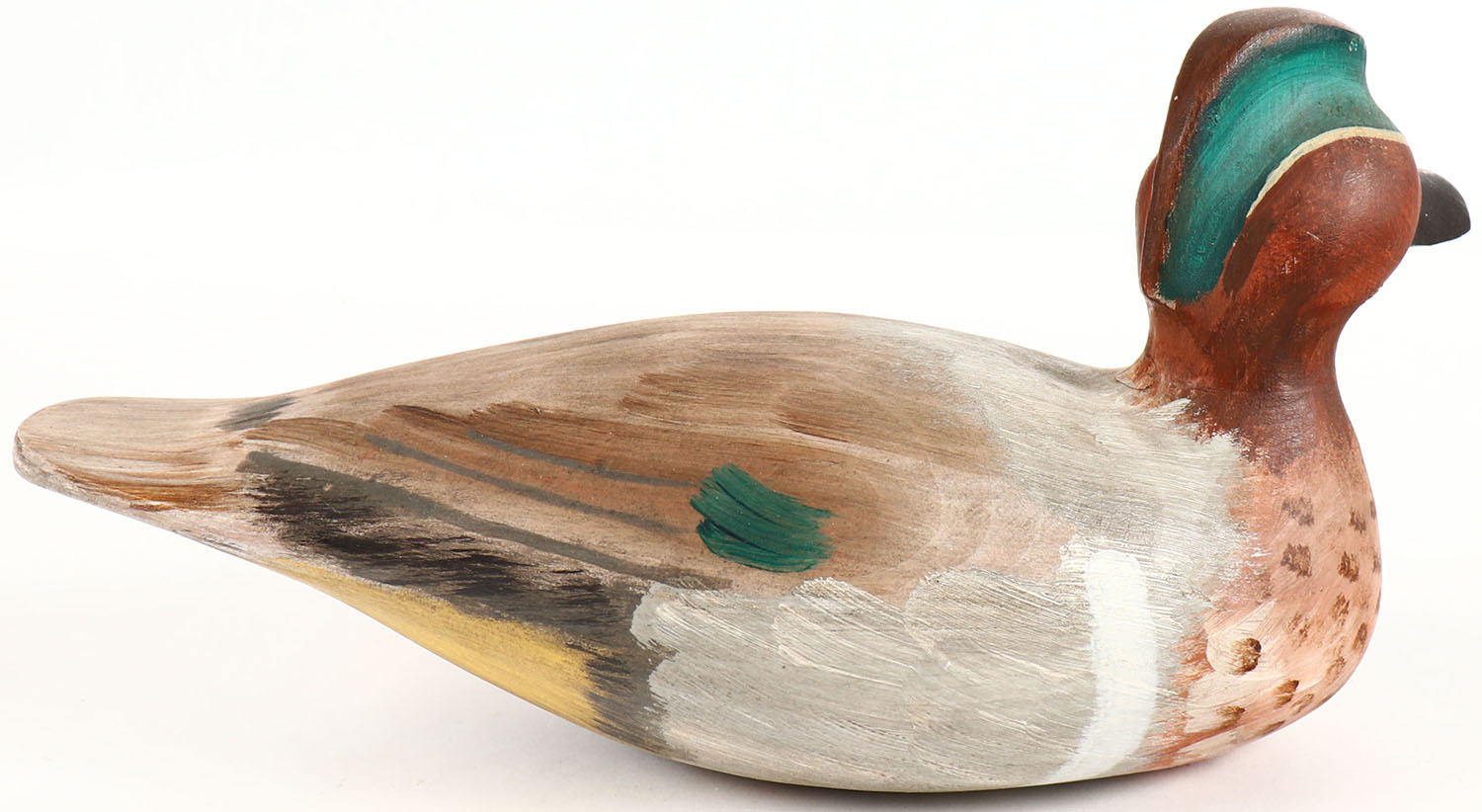 Greenwing Teal Drake by F.C.B. Jr, 1977, no eyes, hollow wood, original paint, 10'' OAL. Grade: Excellent - Value: 20 to 60