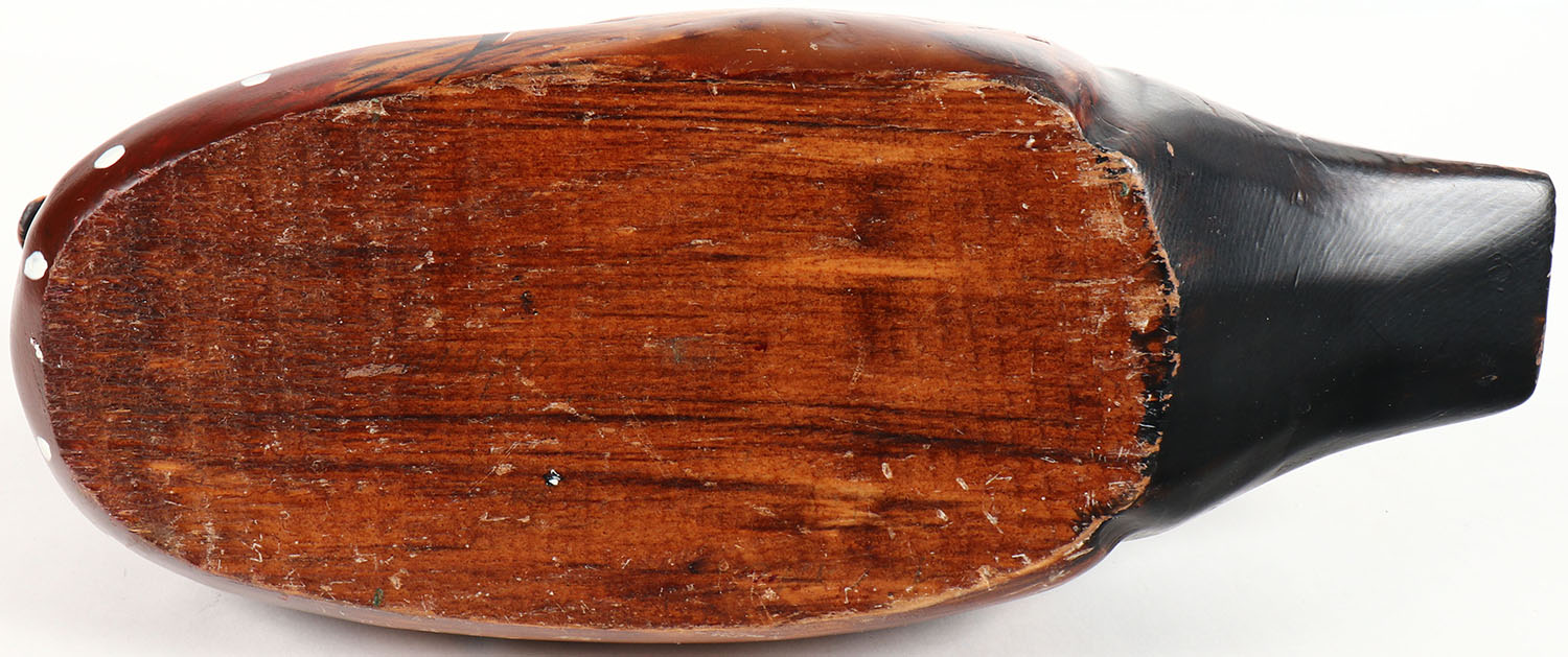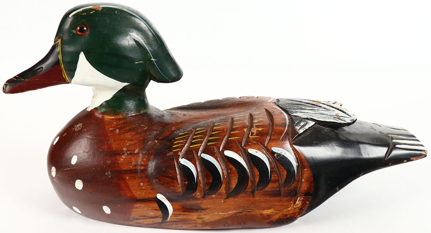 Woodduck Drake by unknown maker, GE, solid wood, original paint, repaired bill crack, 13'' OAL. Grade: Excellent - Value: 20 to 60