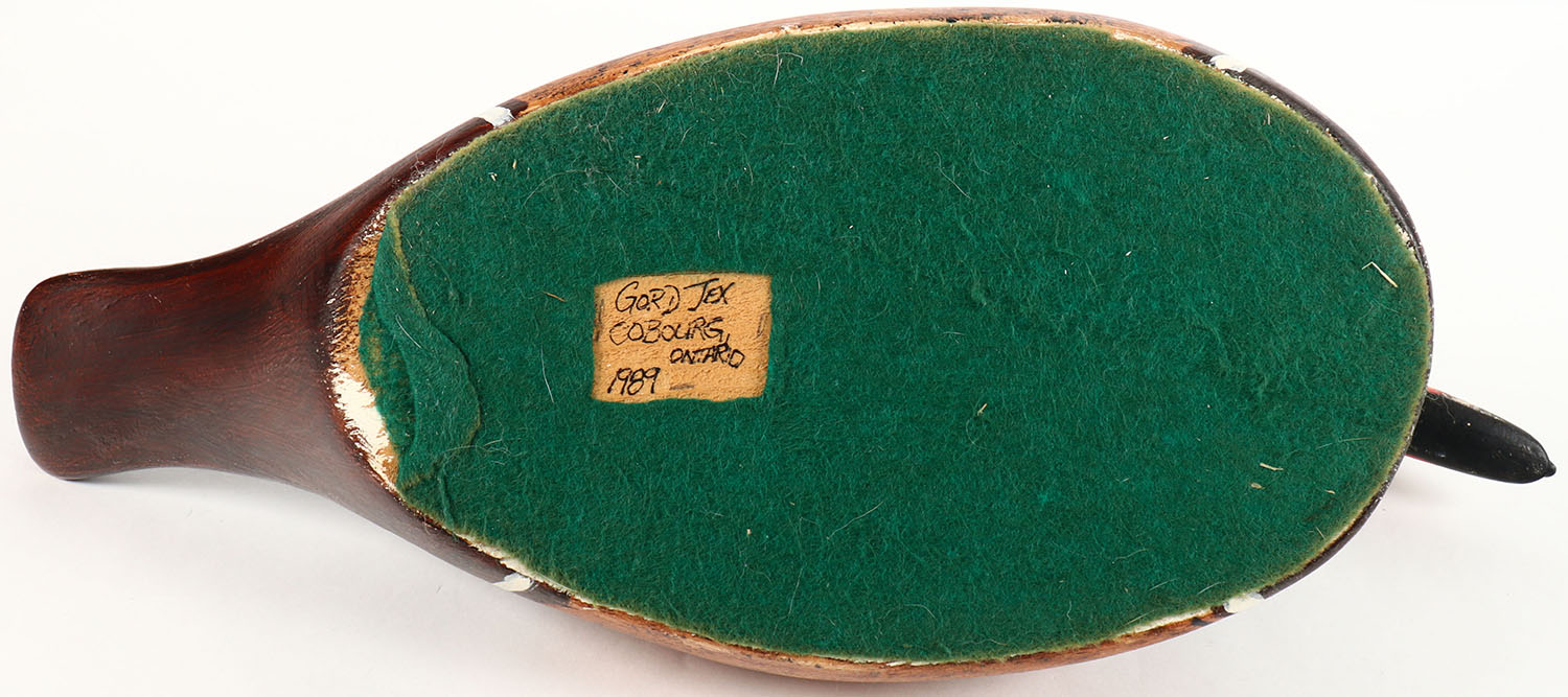 Woodduck Drake by Gord Tex, Cobourg, Ontario, GE, solid wood, original paint, 16'' OAL. Grade: Excellent ++ - Value: 20 to 60