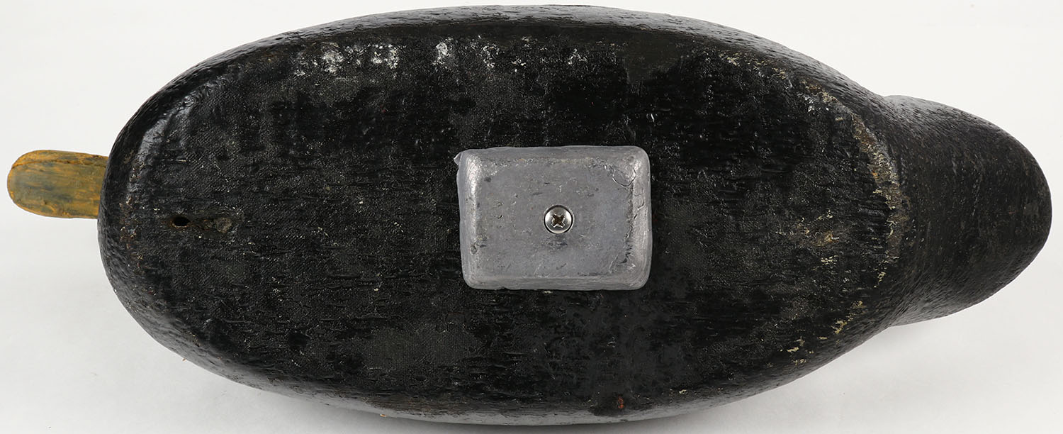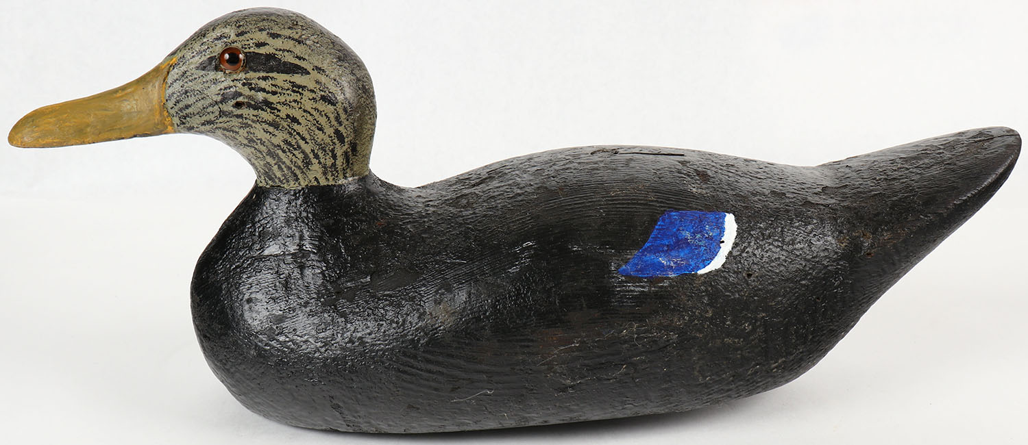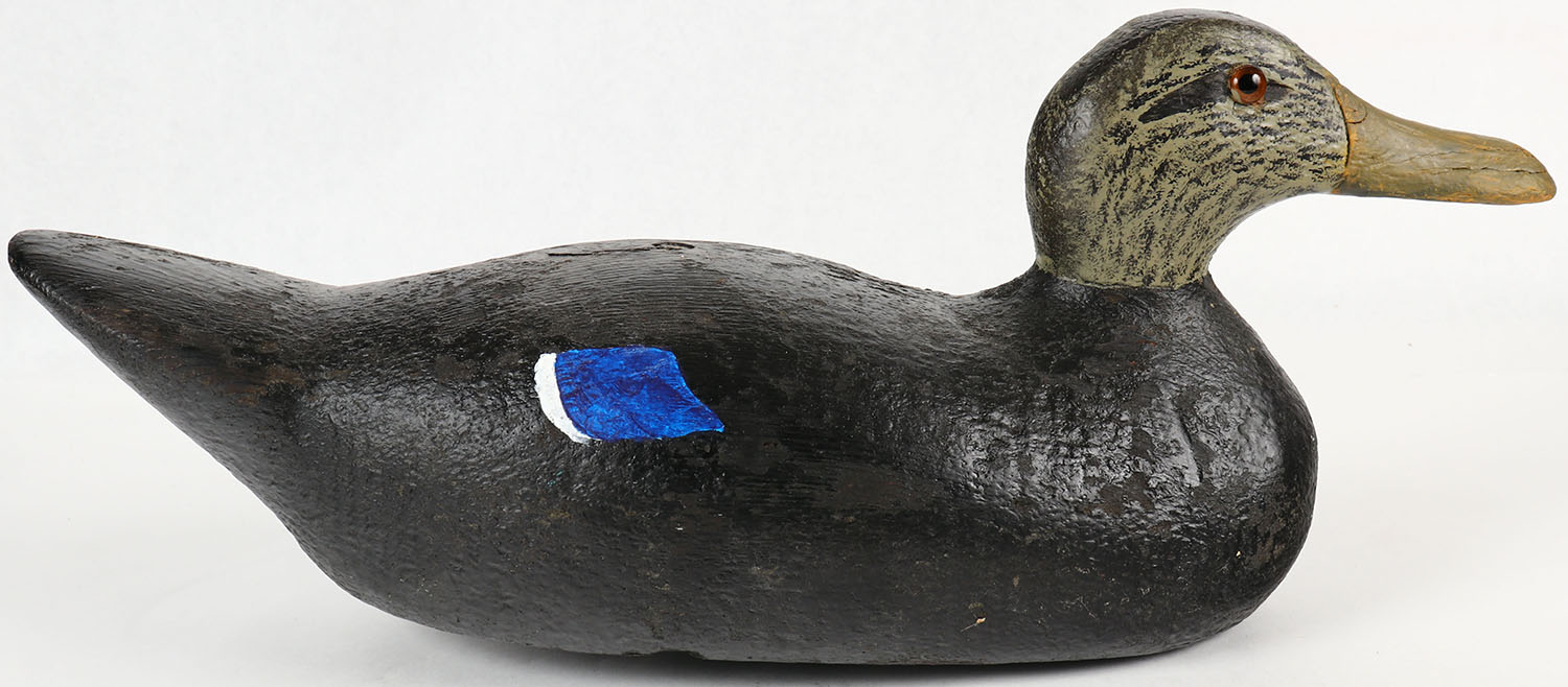 Black Duck by a unknown factory decoy, glass eyes, solid wood, old repaint, 17 OAL. Grade: Excellent - Value: 10 to 40