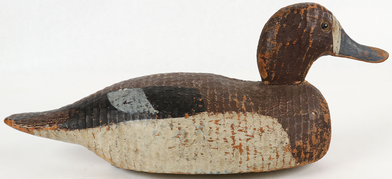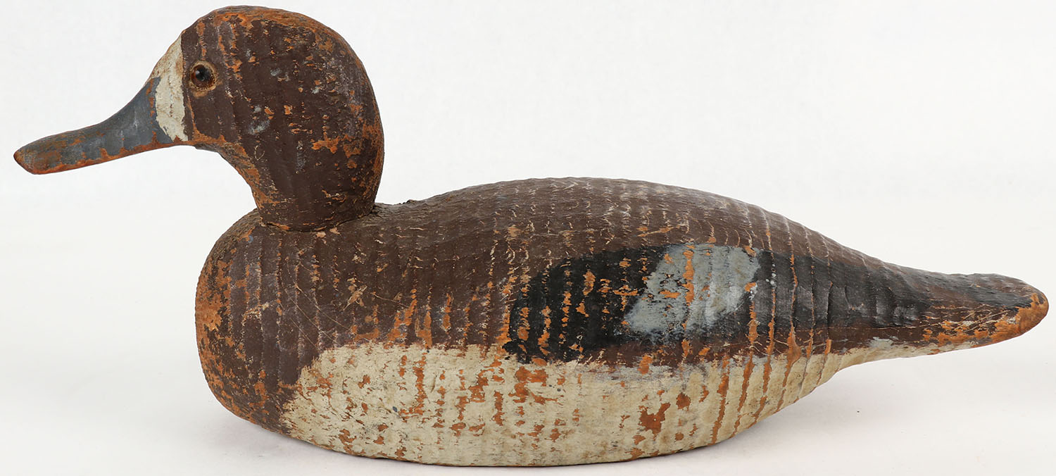 Bluebill Hen by a unknown factory decoy, glass eyes, solid wood, original paint show wear to edges, 13 1/2'' OAL. Grade: Very Good ++ - Value: 10 to 40