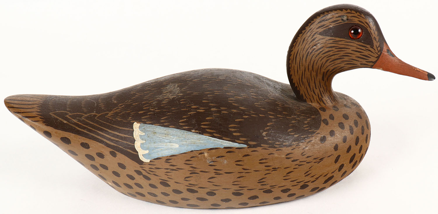 Miniature Mallard Hen by Charles Birdsall, Wildfowler Decoys, GE, solid wood, original paint, structurally excellent, signed on bottom, 10'' OAL. Grade: Excellent ++ - Value: 30 to 90
