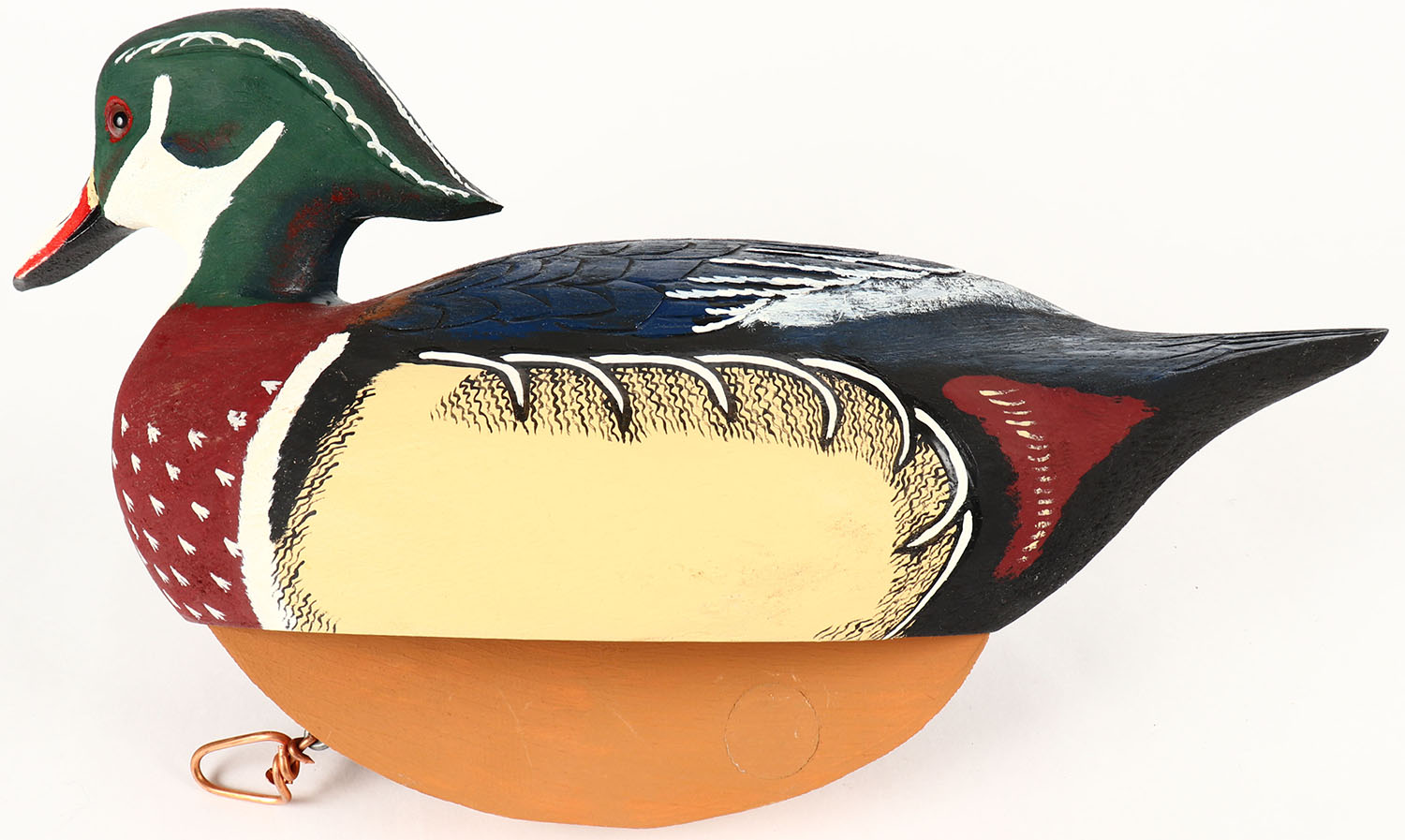Woodduck Drake by Ralph Malpage, GE, solid wood, mint original paint, 14'' OAL. Grade: MINT - Value: 20 to 80