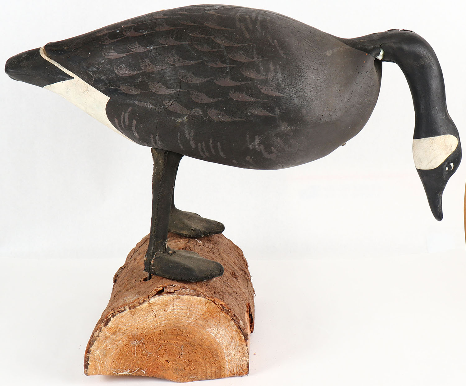 Early Canada Goose by unknown maker, PE, looks like you could have blowen this us as is it now hard rubber & a hole in the neck, large feet mounted on wood stand, 24'' OAL. Grade: Very Good - Value: 10 to 50