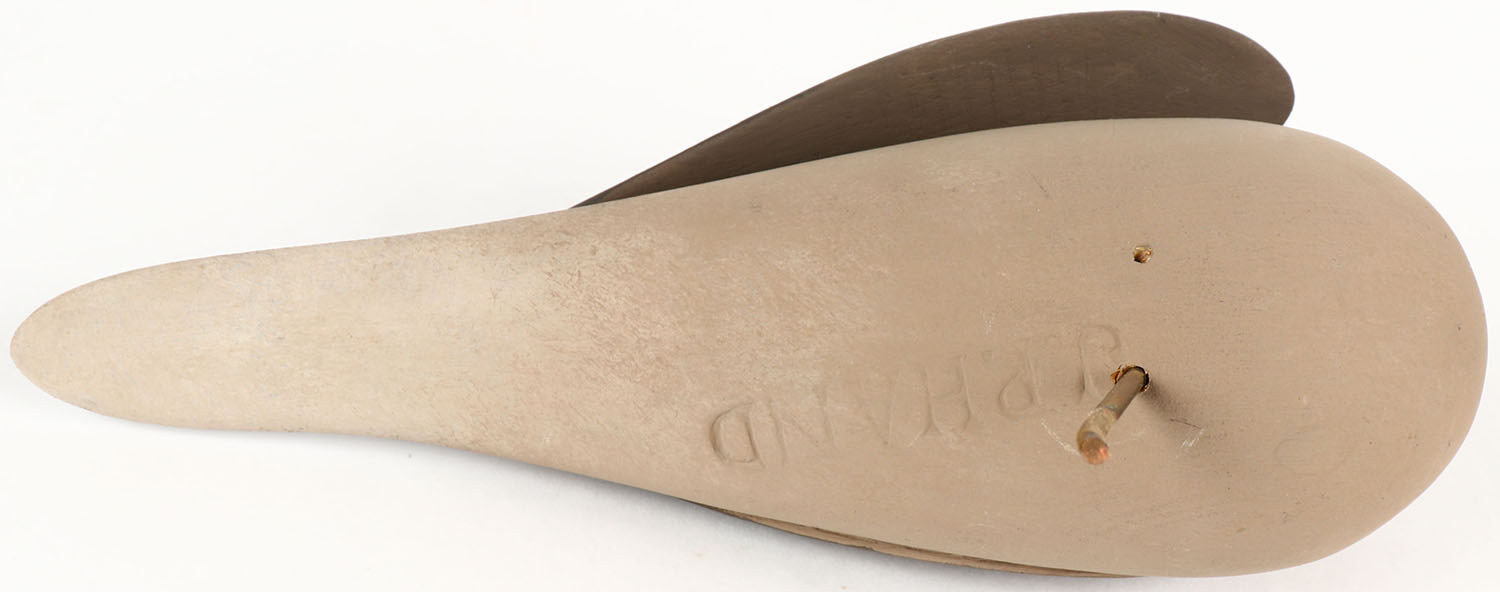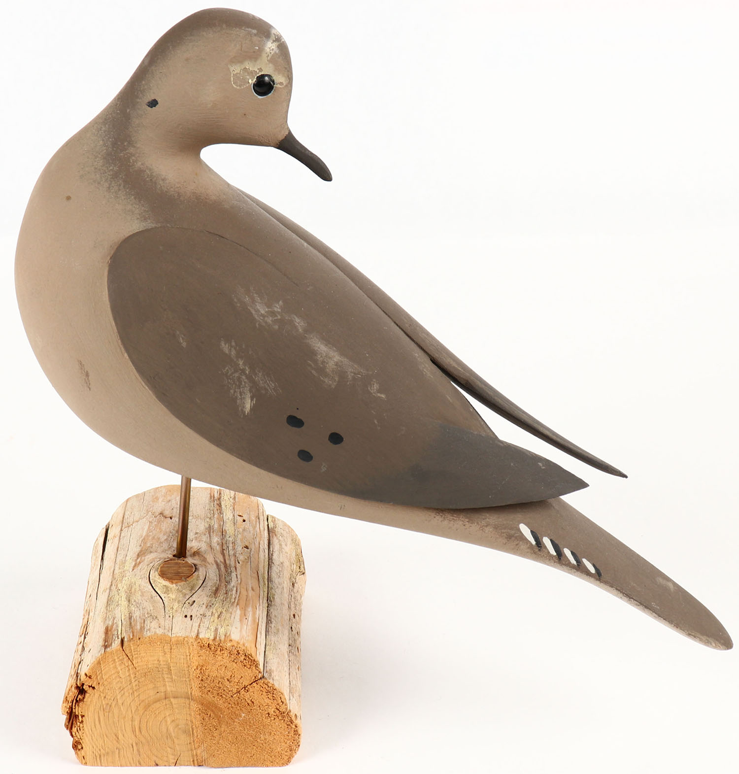 Morning Dove by J.P. Hand, GE, solid wood, original paint, mounted on stand, signed on bottom, 9'' OAL. Grade: Excellent - Value: 2 to 20