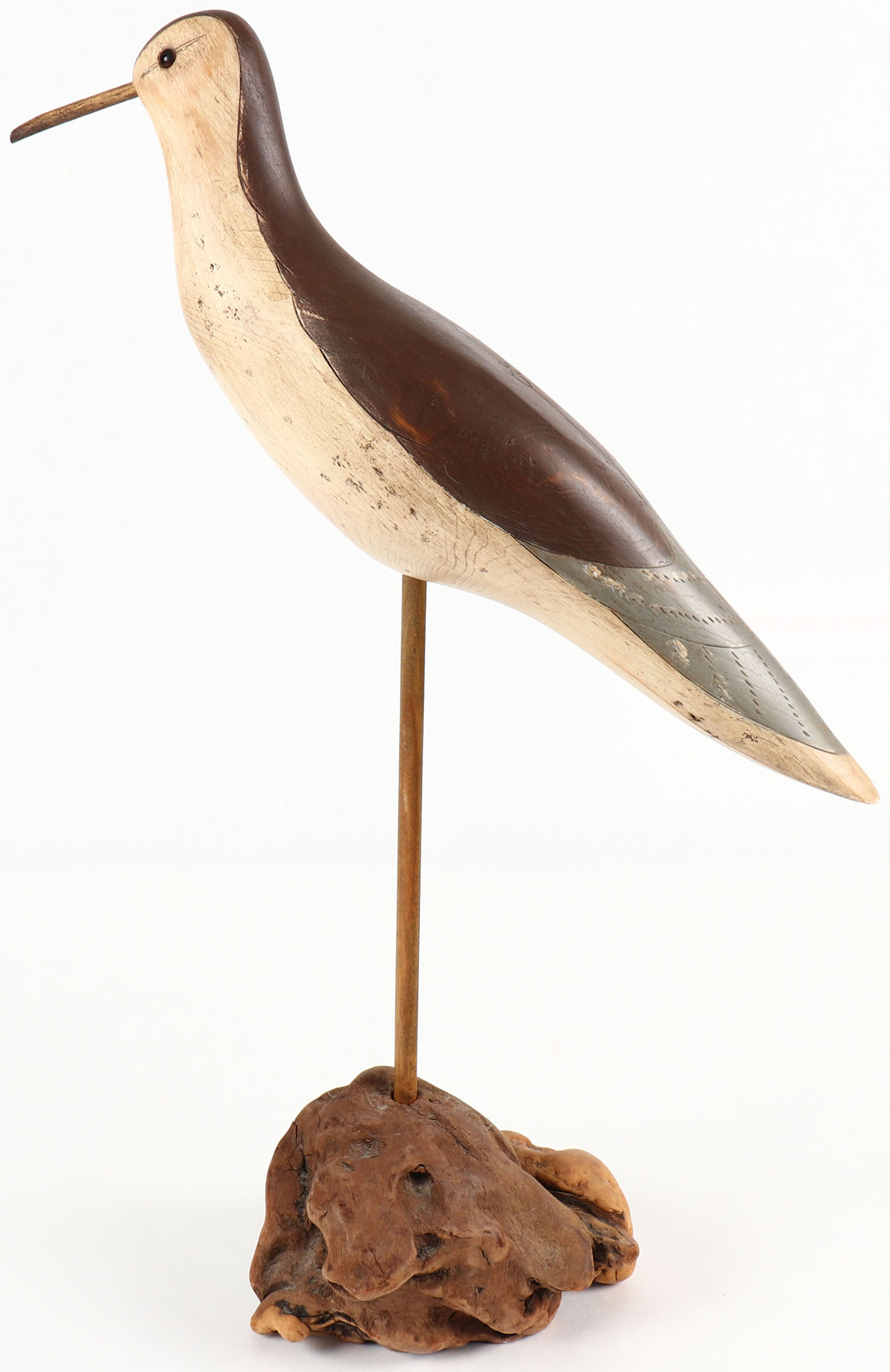 Shorebird by unknown maker, GE, solid wood, original paint, mounted on stand, 12'' OAL. Grade: Excellent - Value: 10 to 30