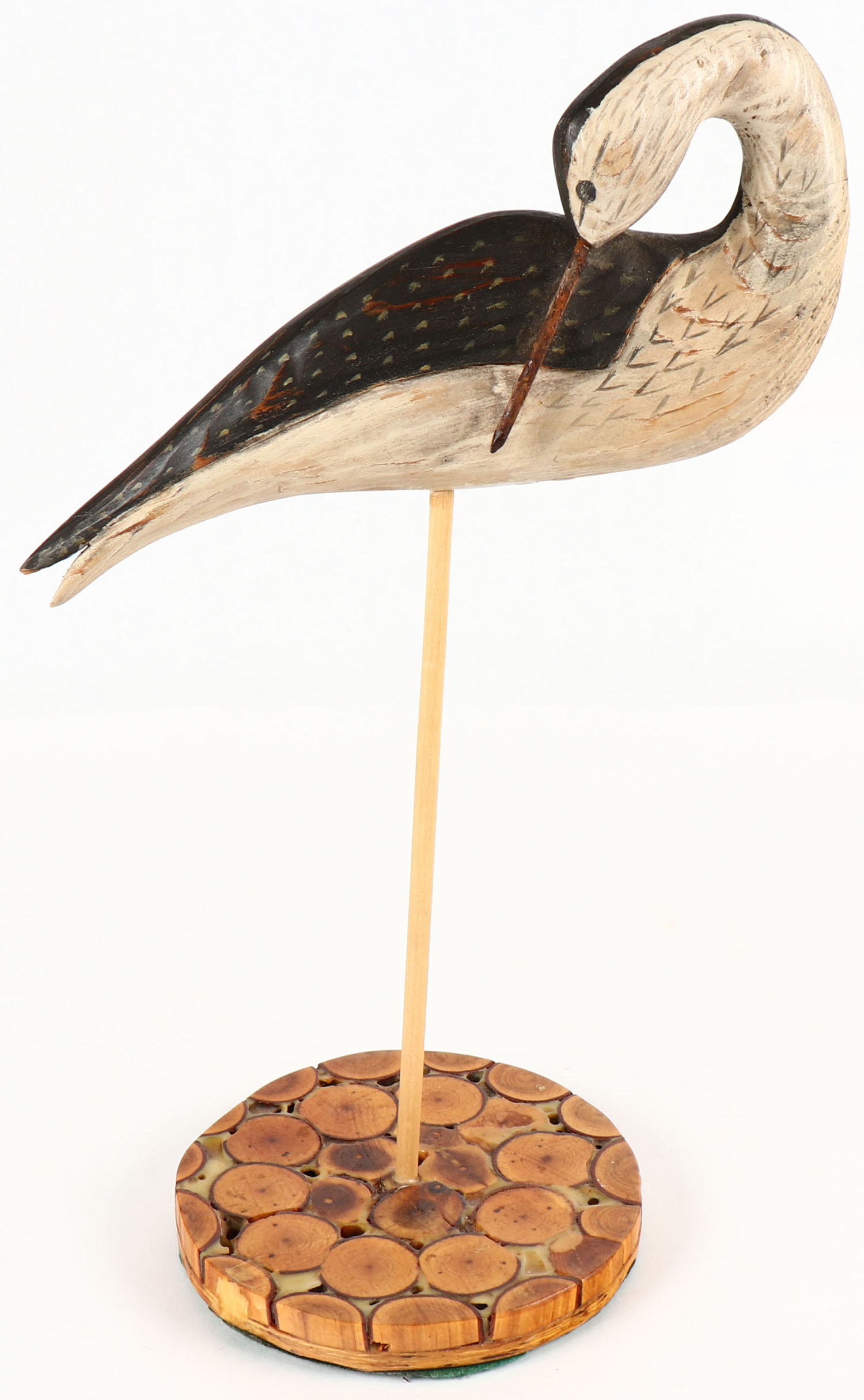 Preening Yellowlegs by unknown maker, PE, solid wood, original paint, mounted on stand, 9'' OAL. Grade: Excellent - Value: 10 to 30