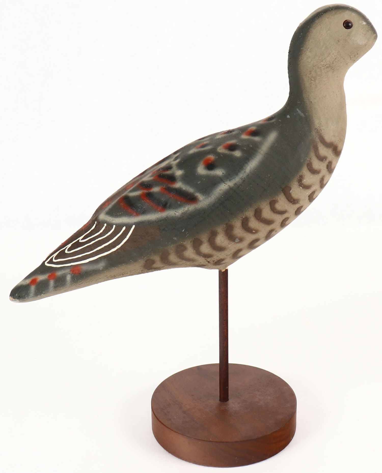 Shorebird by Herters, Minnesota, part of the 1893 series from the 1960s, glass eyes, solid wood, original paint, no bill, structurally excellent. Grade: Excellent - Value: 20 to 60