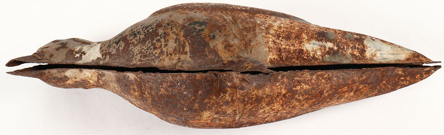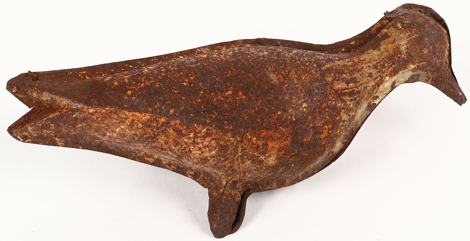 Metal 2pc. Yellowlegs, Shorebird by Strater & Sohier, Boston MA, painted eyes, with wire hinges, original paint shows lots of rust, 10'' OAL. Grade: Good - Value: 2 to 40