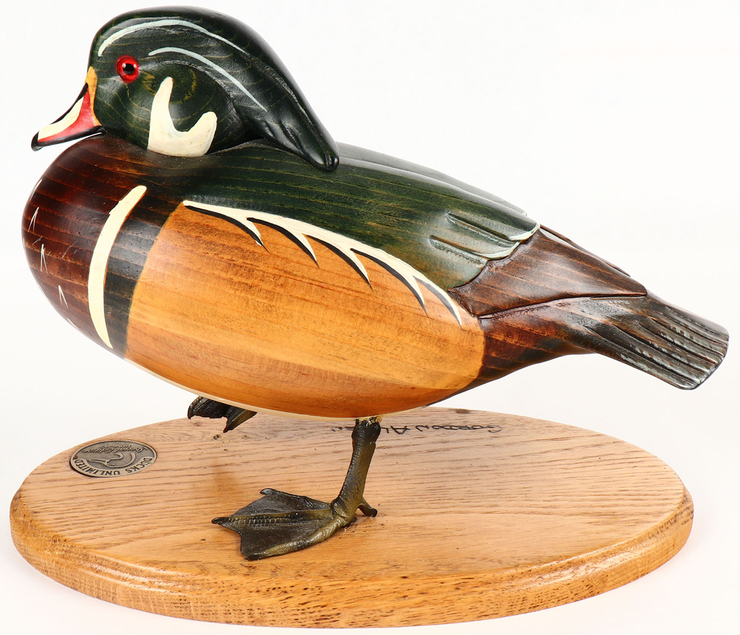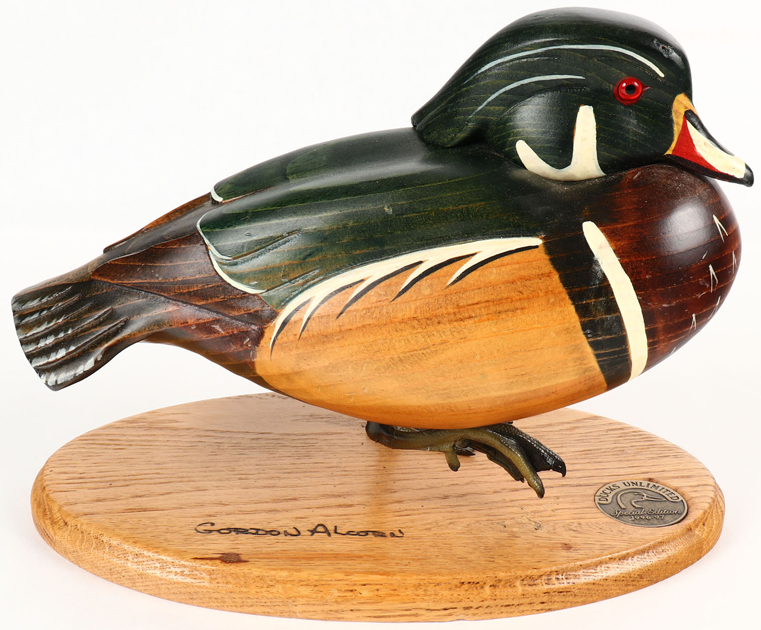 Woodduck Drake by Gordon Alcorn DU, GE solid wood, mint original paint, on stand, 11'' OAL. Grade: MINT - Value: 20 to 60